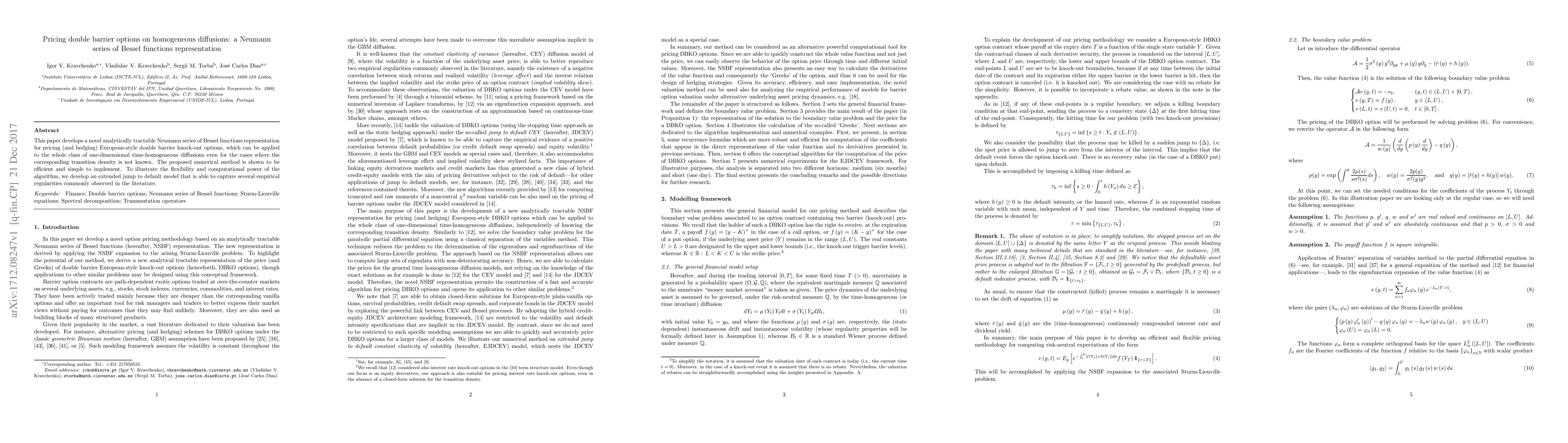 This paper develops a novel analytically tractable Neumann series of Bessel functions representation for pricing (and hedging) European-style double barrier knock-out options, which can be applied to the whole class of one-dimensional time-homogeneous diffusions even for the cases where the corresponding transition density is not known. The proposed numerical method is shown to be efficient and simple to implement. To illustrate the flexibility and computational power of the algorithm, we develop an extended jump to default model that is able to capture several empirical regularities commonly observed in the literature.