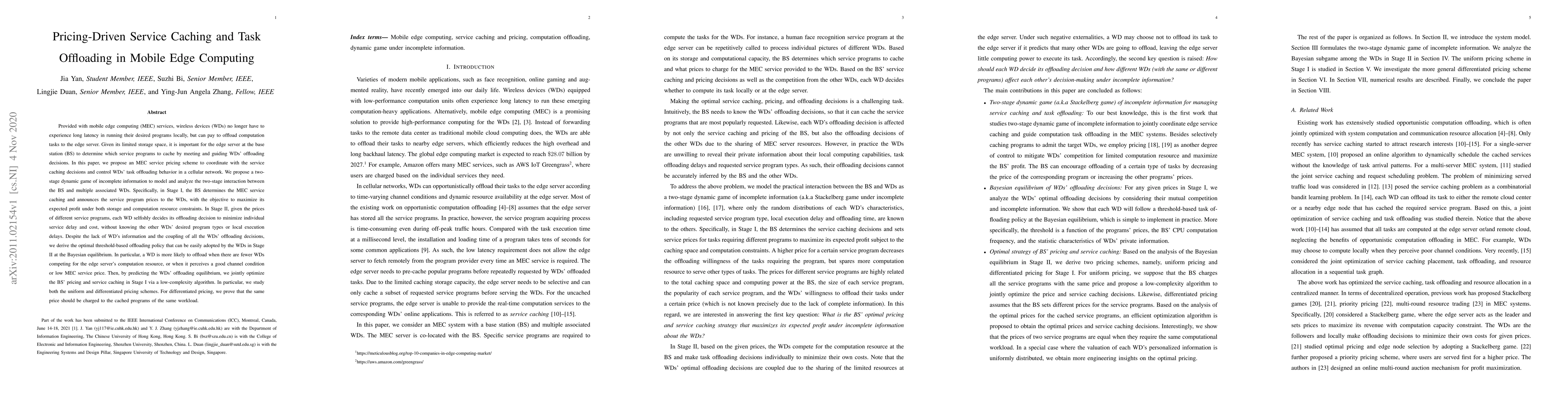 This paper proposes an MEC service pricing scheme to optimize service caching and task offloading in mobile edge computing. It uses a two-stage dynamic game to model interactions between the base station and wireless devices, deriving optimal offloading policies and optimizing pricing and caching strategies to maximize the base station's profit.