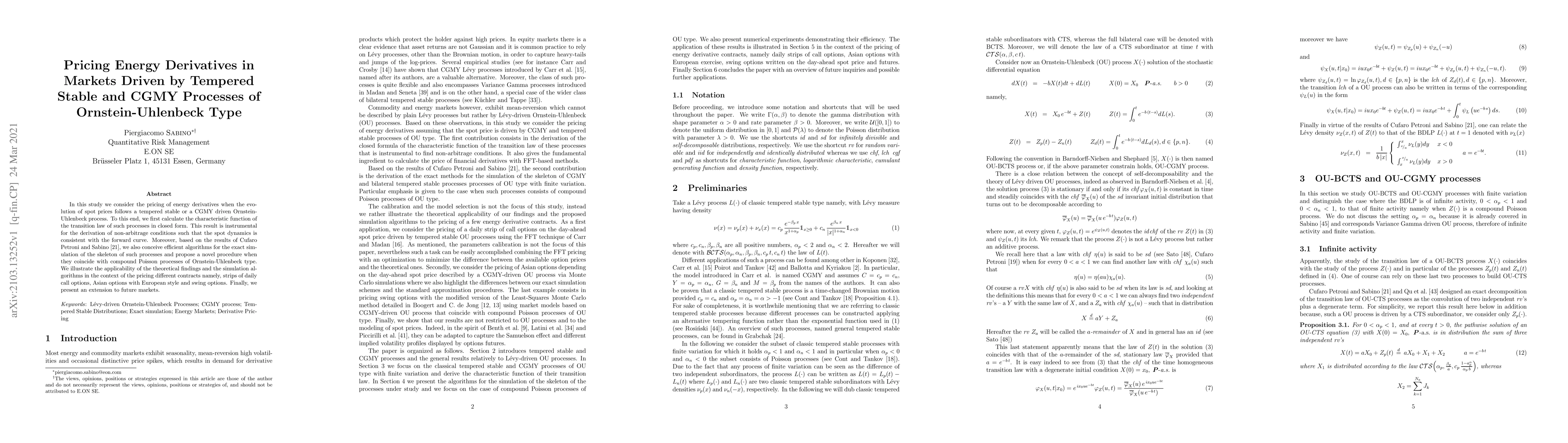 In this study we consider the pricing of energy derivatives when the evolution of spot prices follows a tempered stable or a CGMY driven Ornstein- Uhlenbeck process. To this end, we first calculate the characteristic function of the transition law of such processes in closed form. This result is instrumental for the derivation of non-arbitrage conditions such that the spot dynamics is consistent with the forward curve. Moreover, based on the results of Cufaro Petroni and Sabino (2020), we also conceive efficient algorithms for the exact simulation of the skeleton of such processes and propose a novel procedure when they coincide with compound Poisson processes of Ornstein-Uhlenbeck type. We illustrate the applicability of the theoretical findings and the simulation algorithms in the context of the pricing different contracts namely, strips of daily call options, Asian options with European style and swing options. Finally, we present an extension to future markets.