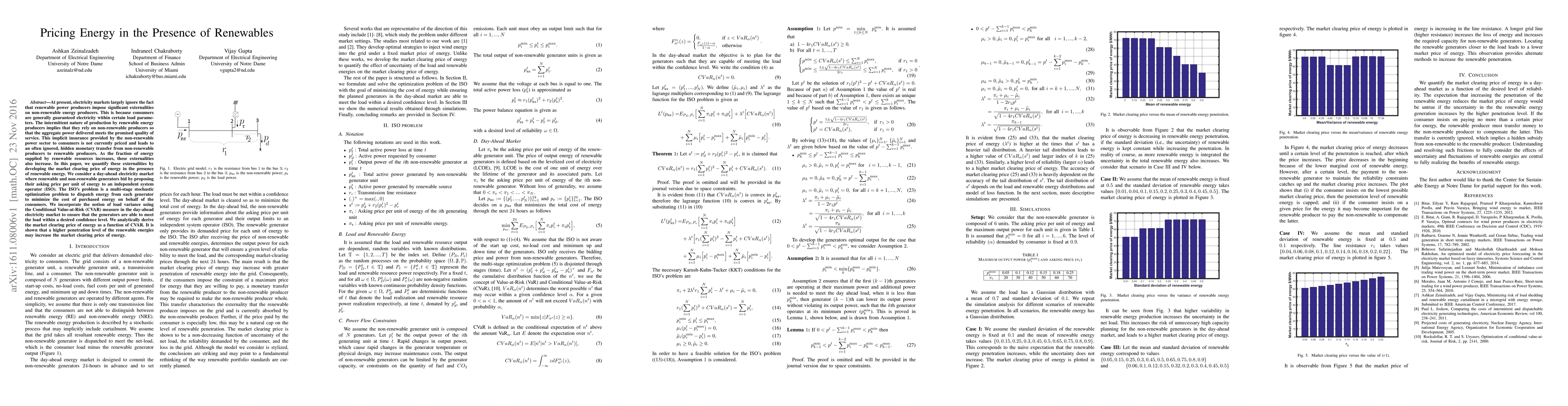 At present, electricity markets largely ignore the fact that renewable power producers impose significant externalities on non-renewable energy producers. This is because consumers are generally guaranteed electricity within certain load parameters. The intermittent nature of production by renewable energy producers implies that they rely on non-renewable producers so that the aggregate power delivered meets the promised quality of service. This implicit insurance provided by the non-renewable power sector to consumers is not currently priced and leads to an often ignored, hidden monetary transfer from non-renewable producers to renewable producers. As the fraction of energy supplied by renewable resources increases, these externalities also increase. In this paper, we quantify these externalities by developing the market clearing price of energy in the presence of renewable energy. We consider a day-ahead electricity market where renewable and non-renewable generators bid by proposing their asking price per unit of energy to an independent system operator (ISO). The ISO's problem is a multi-stage stochastic optimization problem to dispatch energy from each generator to minimize the cost of purchased energy on behalf of the consumers. We incorporate the notion of load variance using the Conditional Value-at-Risk (CVAR) measure in the day-ahead electricity market to ensure that the generators are able to meet the load within a desired confidence level. We analytically derive the market clearing price of energy as a function of CVAR. It is shown that a higher penetration level of the renewable energies may increase the market clearing price of energy.