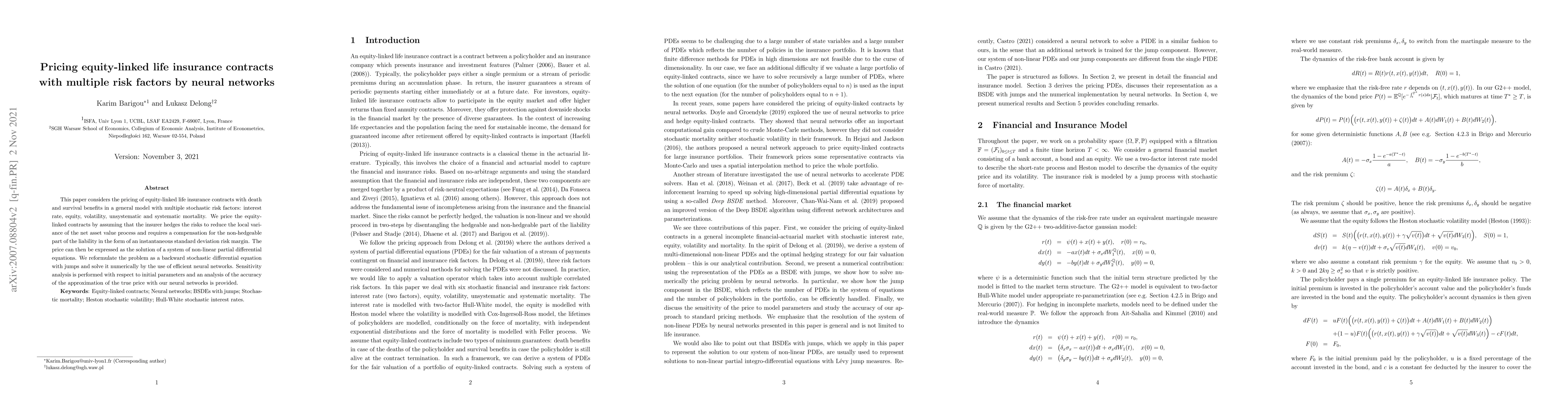 This paper proposes a neural network approach to price equity-linked life insurance contracts considering multiple risk factors, including interest rates and equity volatility. The model reformulates the pricing problem as a backward stochastic differential equation and evaluates the accuracy of neural network approximations.