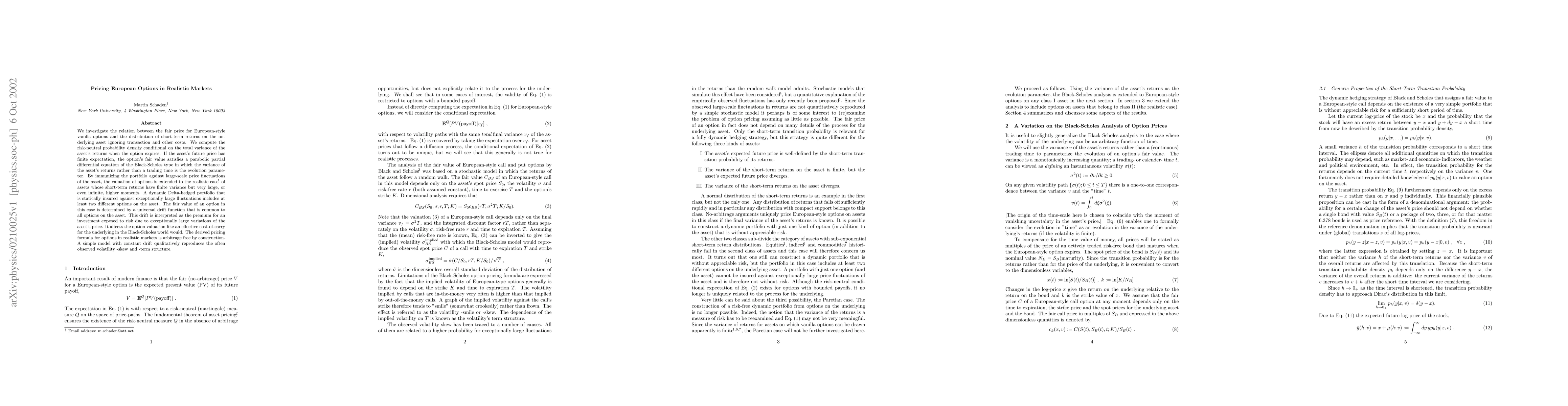 We investigate the relation between the fair price for European-style vanilla options and the distribution of short-term returns on the underlying asset ignoring transaction and other costs. We compute the risk-neutral probability density conditional on the total variance of the asset's returns when the option expires. If the asset's future price has finite expectation, the option's fair value satisfies a parabolic partial differential equation of the Black-Scholes type in which the variance of the asset's returns rather than a trading time is the evolution parameter. By immunizing the portfolio against large-scale price fluctuations of the asset, the valuation of options is extended to the realistic case\cite{St99} of assets whose short-term returns have finite variance but very large, or even infinite, higher moments. A dynamic Delta-hedged portfolio that is statically insured against exceptionally large fluctuations includes at least two different options on the asset. The fair value of an option in this case is determined by a universal drift function that is common to all options on the asset. This drift is interpreted as the premium for an investment exposed to risk due to exceptionally large variations of the asset's price. It affects the option valuation like an effective cost-of-carry for the underlying in the Black-Scholes world would. The derived pricing formula for options in realistic markets is arbitrage free by construction. A simple model with constant drift qualitatively reproduces the often observed volatility -skew and -term structure.