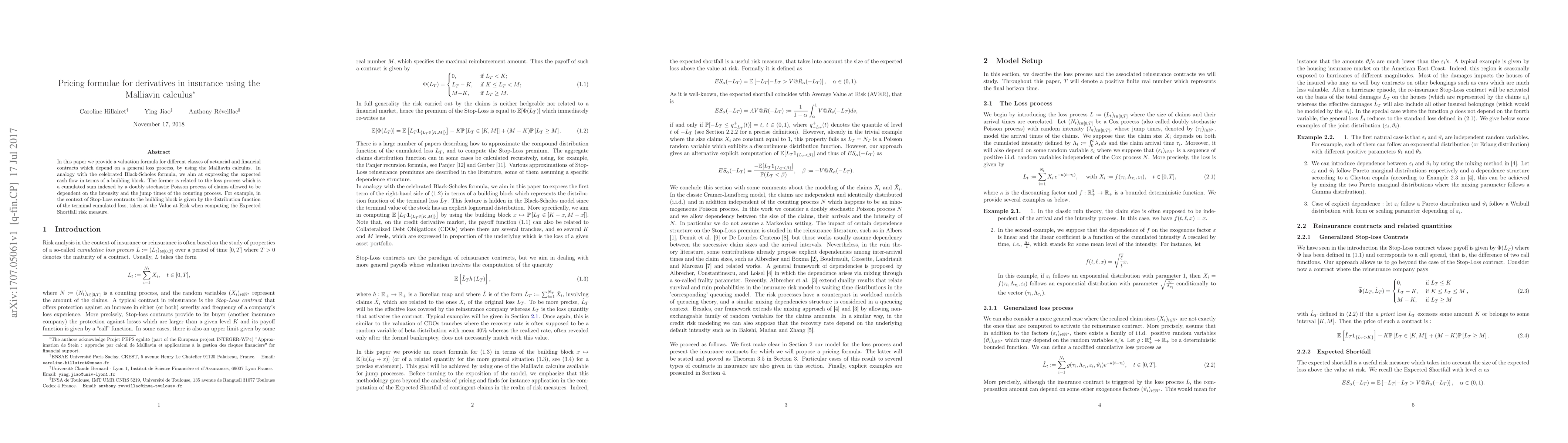 This paper introduces a valuation formula for various actuarial and financial contracts using the Malliavin calculus, analogous to the Black-Scholes formula, and expresses expected cash flows in terms of a building block related to a doubly stochastic Poisson process of claims. For Stop-Loss contracts, the building block is derived from the distribution function of terminal cumulated loss at the Value at Risk.