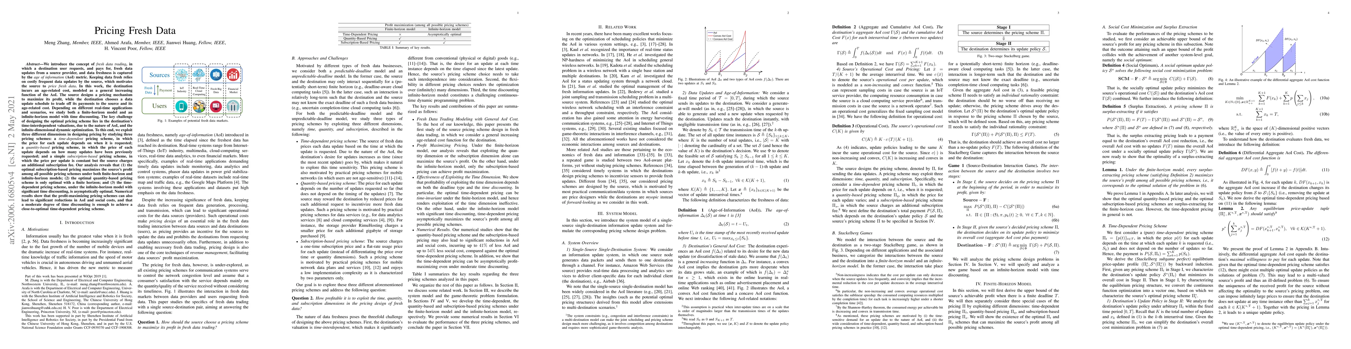 We introduce the concept of {\it fresh data trading}, in which a destination user requests, and pays for, fresh data updates from a source provider, and data freshness is captured by the {\it age of information} (AoI) metric. Keeping data fresh relies on frequent data updates by the source, which motivates the source to {\it price fresh data}. In this work, the destination incurs an age-related cost, modeled as a general increasing function of the AoI. The source designs a pricing mechanism to maximize its profit; the destination chooses a data update schedule to trade off its payments to the source and its age-related cost. Depending on different real-time applications and scenarios, we study both a predictable-deadline and an unpredictable-deadline models. The key challenge of designing the optimal pricing scheme lies in the destination's time-interdependent valuations, due to the nature of AoI and the infinite-dimensional and dynamic optimization. To this end, we consider three pricing schemes that exploit and understand the profitability of three different dimensions in designing pricing: a {\it time-dependent} pricing scheme, in which the price for each update depends on when it is requested; a {\it quantity-based} pricing scheme, in which the price of each update depends on how many updates have been previously requested; a {\it subscription-based} pricing scheme, in which the price for each update is flat-rate but the source charges an additional subscription fee. Our analysis reveals that the optimal subscription-based pricing maximizes the source's profit among all possible pricing schemes under both predictable deadline and unpredictable deadline models; the optimal quantity-based pricing scheme is only optimal with a predictable deadline; the time-dependent pricing scheme, under the unpredictable deadline, is asymptotically optimal under significant time discounting.