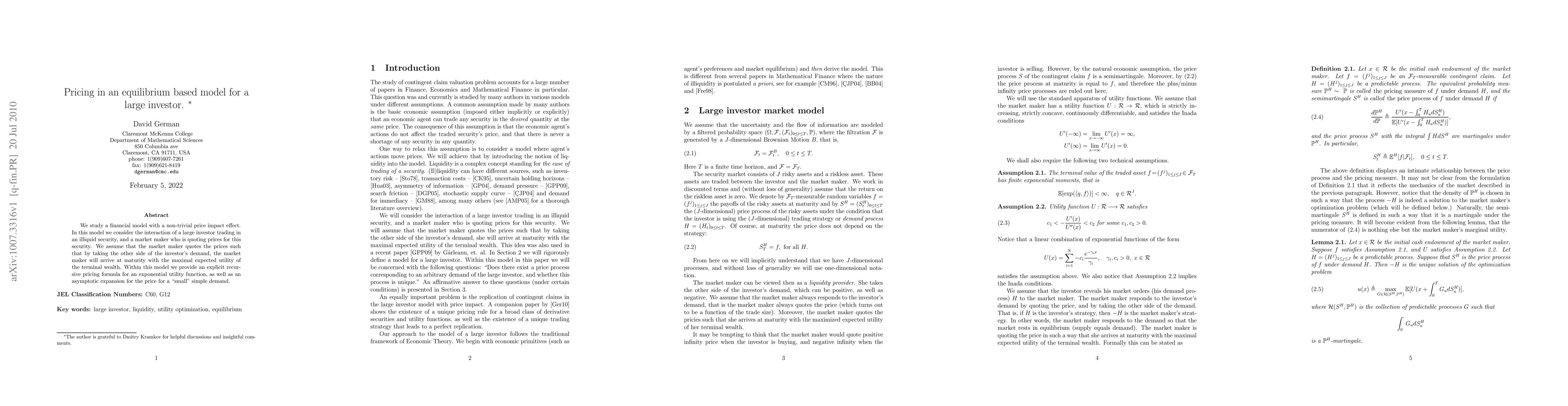 This paper develops a financial model for a large investor trading in an illiquid security, considering the market maker's optimal pricing strategy to maximize terminal wealth utility. It provides an explicit recursive pricing formula and an asymptotic expansion for small simple demands.