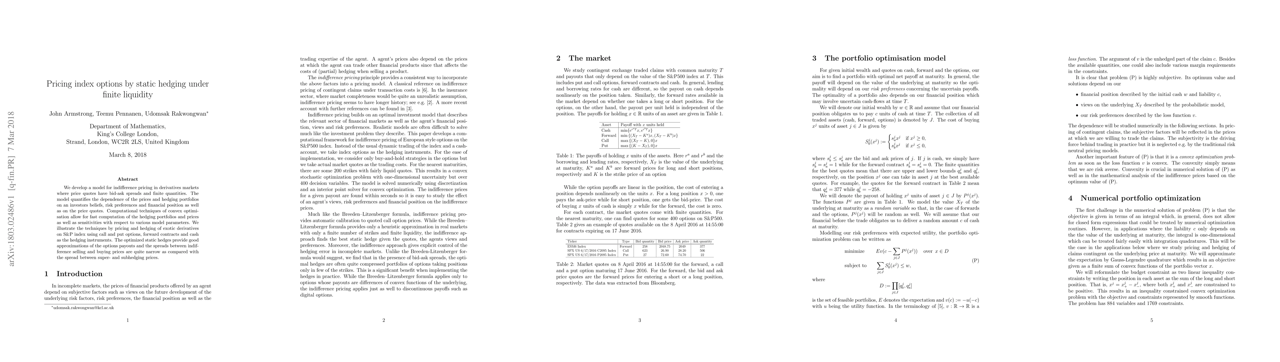 The paper proposes a model for pricing index options under static hedging in markets with finite liquidity and bid-ask spreads, using convex optimization for efficient computation. The model accounts for investor beliefs and risk preferences, and demonstrates its application by pricing and hedging exotic derivatives on the S&P index, showing narrow spreads between indifference selling and buying prices.