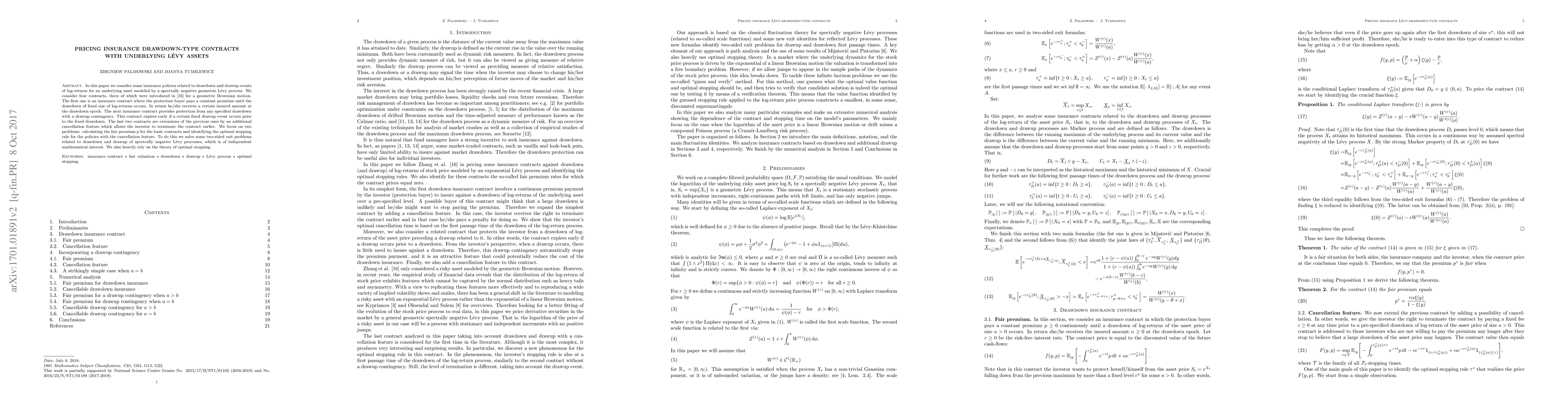 In this paper we consider some insurance policies related to drawdown and drawup events of log-returns for an underlying asset modeled by a spectrally negative geometric L\'evy process. We consider four contracts, three of which were introduced in Zhang et al. (2013) for a geometric Brownian motion. The first one is an insurance contract where the protection buyer pays a constant premium until the drawdown of fixed size of log-returns occurs. In return he/she receives a certain insured amount at the drawdown epoch. The next insurance contract provides protection from any specified drawdown with a drawup contingency. This contract expires early if a certain fixed drawup event occurs prior to the fixed drawdown. The last two contracts are extensions of the previous ones by an additional cancellation feature which allows the investor to terminate the contract earlier. We focus on two problems: calculating the fair premium $p$ for the basic contracts and identifying the optimal stopping rule for the policies with the cancellation feature. To do this we solve some two-sided exit problems related to drawdown and drawup of spectrally negative L\'evy processes, which is of independent mathematical interest. We also heavily rely on the theory of optimal stopping.