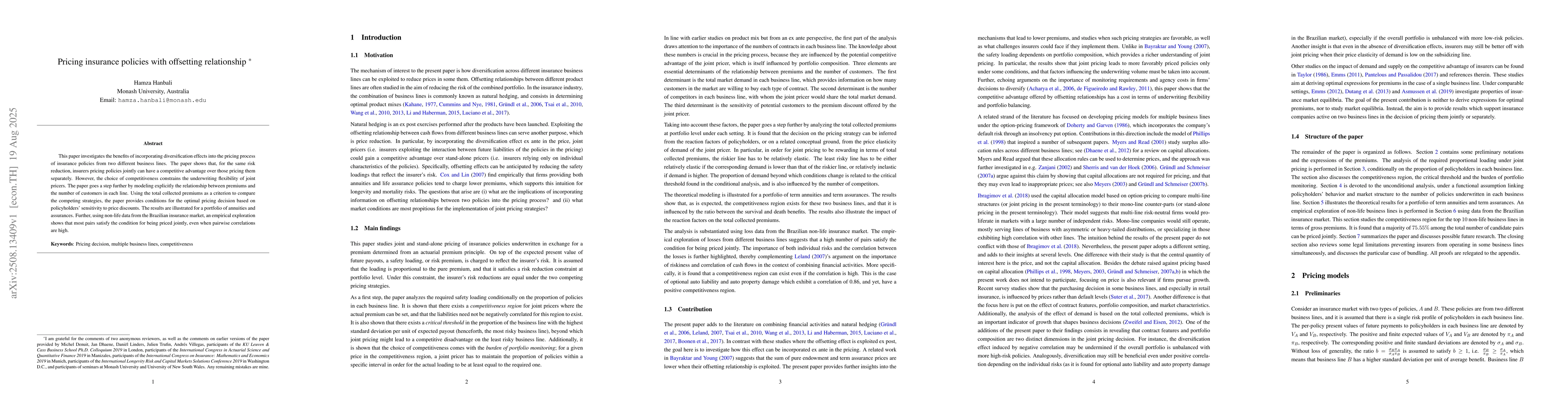 This paper investigates the benefits of incorporating diversification effects into the pricing process of insurance policies from two different business lines. The paper shows that, for the same risk reduction, insurers pricing policies jointly can have a competitive advantage over those pricing them separately. However, the choice of competitiveness constrains the underwriting flexibility of joint pricers. The paper goes a step further by modeling explicitly the relationship between premiums and the number of customers in each line. Using the total collected premiums as a criterion to compare the competing strategies, the paper provides conditions for the optimal pricing decision based on policyholders' sensitivity to price discounts. The results are illustrated for a portfolio of annuities and assurances. Further, using non-life data from the Brazilian insurance market, an empirical exploration shows that most pairs satisfy the condition for being priced jointly, even when pairwise correlations are high.