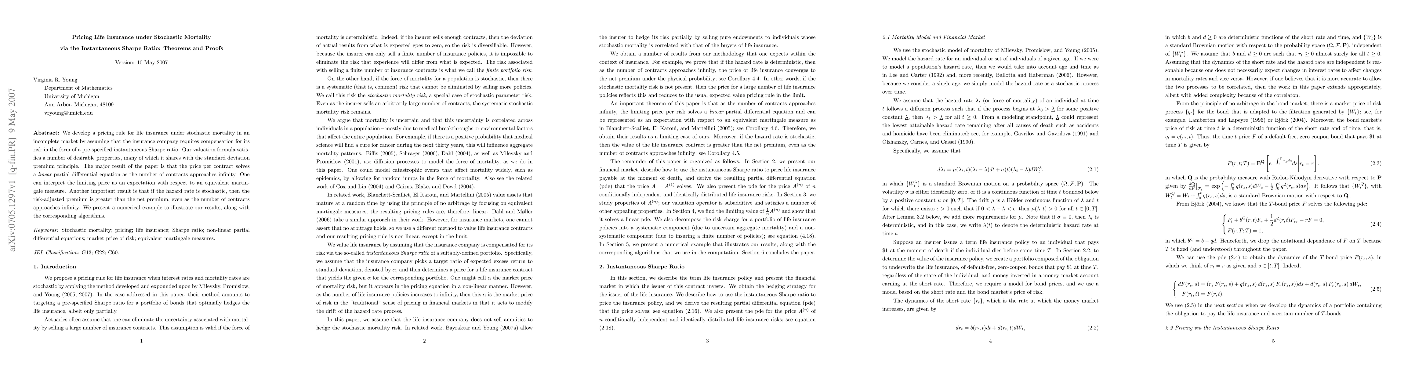 This paper proposes a pricing rule for life insurance under stochastic mortality, based on the insurance company's required instantaneous Sharpe ratio. It demonstrates that the price per contract converges to a solution of a linear partial differential equation, interpreted as an expectation under an equivalent martingale measure, and shows that risk-adjusted premiums exceed net premiums when mortality rates are stochastic.