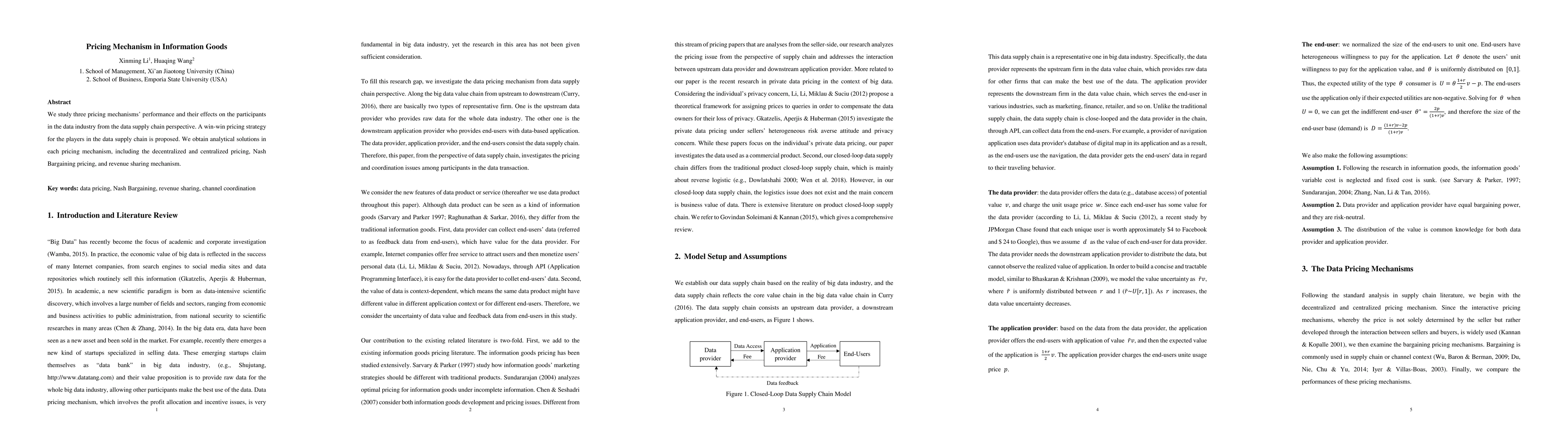 We study three pricing mechanisms' performance and their effects on the participants in the data industry from the data supply chain perspective. A win-win pricing strategy for the players in the data supply chain is proposed. We obtain analytical solutions in each pricing mechanism, including the decentralized and centralized pricing, Nash Bargaining pricing, and revenue sharing mechanism.