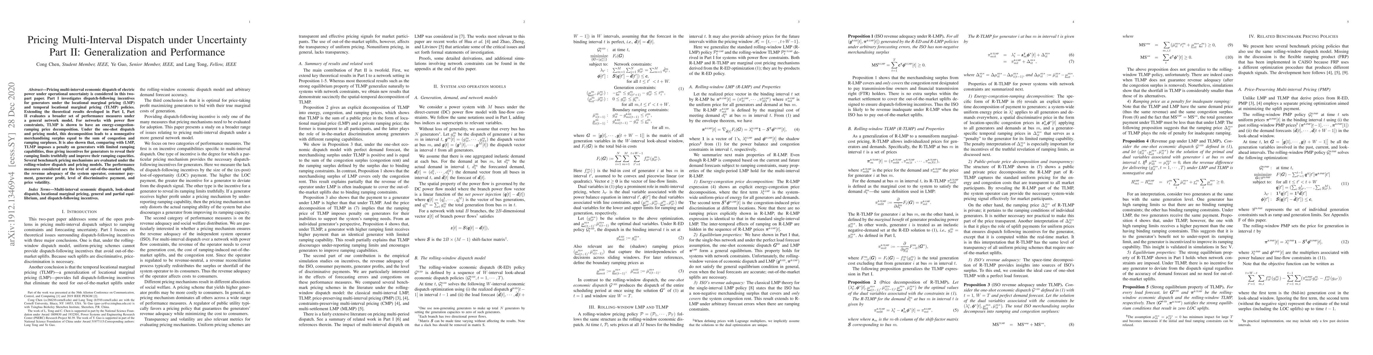 Pricing multi-interval economic dispatch of electric power under operational uncertainty is considered in this two-part paper. Part I investigates dispatch-following incentives for generators under the locational marginal pricing (LMP) and temporal locational marginal pricing (TLMP) policies. Extending the theoretical results developed in Part I, Part II evaluates a broader set of performance measures under a general network model. For networks with power flow constraints, TLMP is shown to have an energy-congestion-ramping price decomposition. Under the one-shot dispatch and pricing model, this decomposition leads to a nonnegative merchandising surplus equal to the sum of congestion and ramping surpluses. It is also shown that, comparing with LMP, TLMP imposes a penalty on generators with limited ramping capabilities, thus giving incentives for generators to reveal their ramping limits truthfully and improve their ramping capacities. Several benchmark pricing mechanisms are evaluated under the rolling-window dispatch and pricing models. The performance measures considered are the level of out-of-the-market uplifts, the revenue adequacy of the system operator, consumer payment, generator profit, level of discriminative payment, and price volatility.
