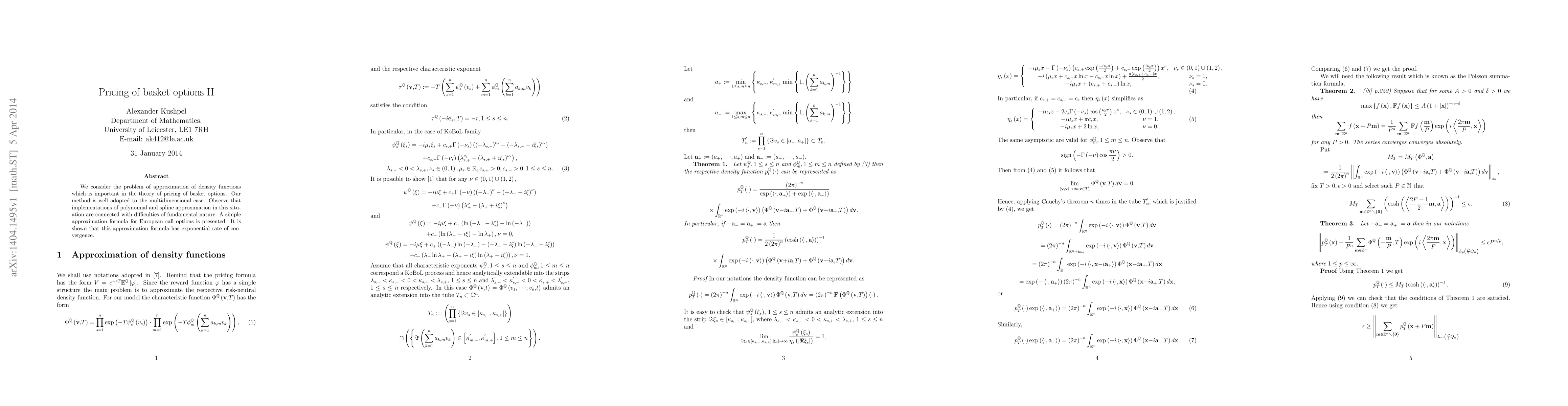 We consider the problem of approximation of density functions which is important in the theory of pricing of basket options. Our method is well adopted to the multidimensional case. Observe that implementations of polynomial and spline approximation in this situation are connected with difficulties of fundamental nature. A simple approximation formula for European call options is presented. It is shown that this approximation formula has exponential rate of convergence.