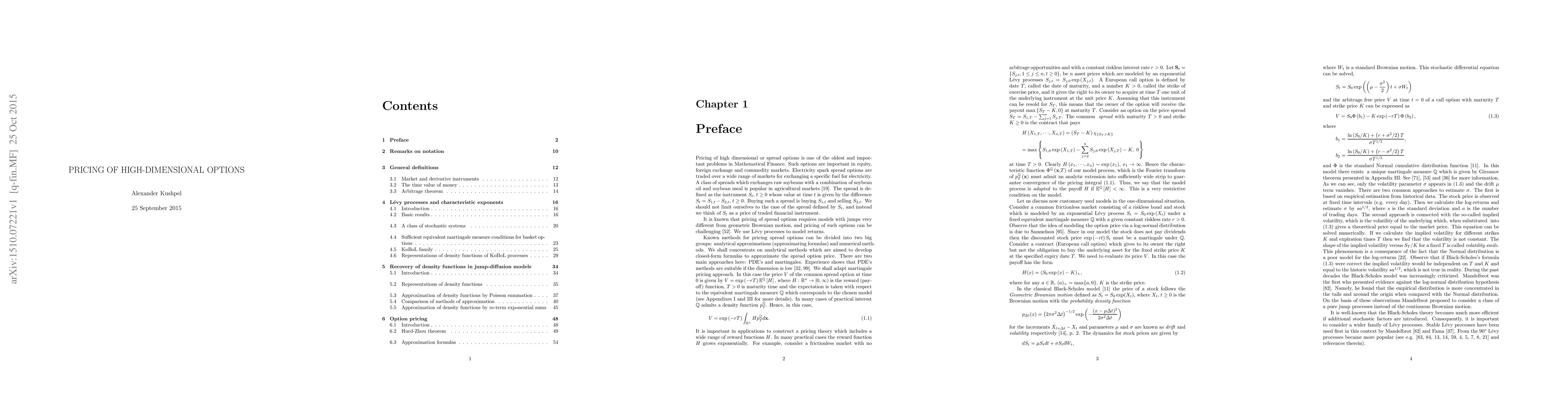 Pricing of high-dimensional options is one of the most important problems in Mathematical Finance. The objective of this manuscript is to present an original self-contained treatment of the multidimensional pricing. During the past decades the Black-Scholes this model, which essentially is based on the log-normal assumption, has been increasingly criticised. In particular, it was noticed by Mandelbrot that empirical log-returns distributions are more concentrated around the origin and have considerably heavier tails. This suggests to adjust the Black-Scholes model by the introduction of the Levy processes instead of Brownian ones. This approach has been extensively studied in a univariate setup since the nineties. In the multivariate settings the theory is not so advanced. We present a general method of high-dimensional option pricing based on a wide range of jump-diffusion models. Namely, we construct approximation formulas for the price of spread options. It is important to get an efficient approximation for the respective density function, since the reward function has usually a simple structure. Instead of a commonly used tabulation approach, we use the respective m-widths to compare a wide range of numerical methods. We give an algorithm of almost optimal, in the sense of the respective m-widths, reconstruction of density functions. To demonstrate the power of our approach we consider in details a concrete class of Levy driven processes and present the respective rates of convergence of approximation formulas. The interrelationship between the theory and tools reflects the richness and deep connections in Financial Mathematics, Stochastic Processes, Theory of Martingales, Functional Analysis, Topology and Harmonic Analysis.