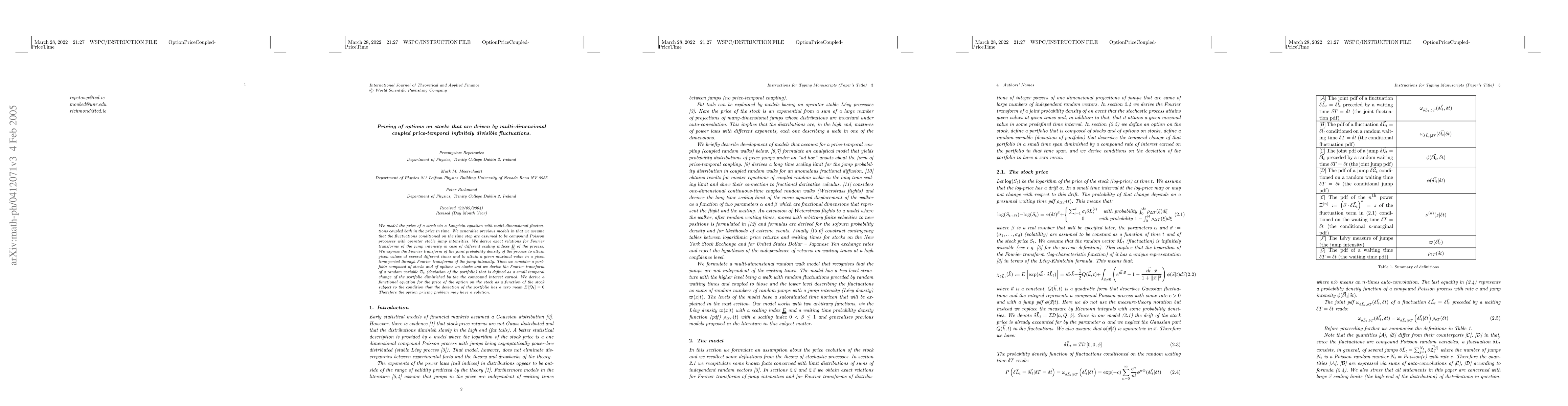 We model the price of a stock via a Lang\'{e}vin equation with multi-dimensional fluctuations coupled in the price and in time. We generalize previous models in that we assume that the fluctuations conditioned on the time step are compound Poisson processes with operator stable jump intensities. We derive exact relations for Fourier transforms of the jump intensity in case of different scaling indices $\underline{\underline{E}}$ of the process. We express the Fourier transform of the joint probability density of the process to attain given values at several different times and to attain a given maximal value in a given time period through Fourier transforms of the jump intensity. Then we consider a portfolio composed of stocks and of options on stocks and we derive the Fourier transform of a random variable $\mathfrak{D}_t$ (deviation of the portfolio) that is defined as a small temporal change of the portfolio diminished by the the compound interest earned. We show that if the price of the option at time $t$ satisfies a certain functional equation specified in text then the deviation of the portfolio has a zero mean $E[ \mathfrak{D}_t ] = 0$ and the option pricing problem may have a solution. We compare our approach to other approaches that assumed the log-characteristic function of the fluctuations that drive the stock price to be an analytic function.