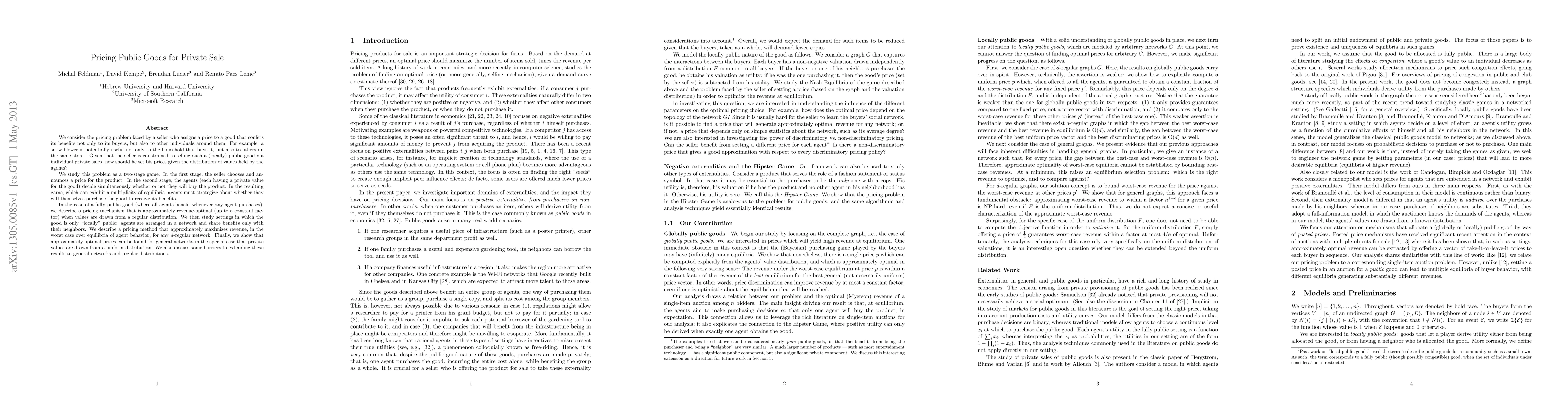 We consider the pricing problem faced by a seller who assigns a price to a good that confers its benefits not only to its buyers, but also to other individuals around them. For example, a snow-blower is potentially useful not only to the household that buys it, but also to others on the same street. Given that the seller is constrained to selling such a (locally) public good via individual private sales, how should he set his prices given the distribution of values held by the agents? We study this problem as a two-stage game. In the first stage, the seller chooses and announces a price for the product. In the second stage, the agents (each having a private value for the good) decide simultaneously whether or not they will buy the product. In the resulting game, which can exhibit a multiplicity of equilibria, agents must strategize about whether they will themselves purchase the good to receive its benefits. In the case of a fully public good (where all agents benefit whenever any agent purchases), we describe a pricing mechanism that is approximately revenue-optimal (up to a constant factor) when values are drawn from a regular distribution. We then study settings in which the good is only "locally" public: agents are arranged in a network and share benefits only with their neighbors. We describe a pricing method that approximately maximizes revenue, in the worst case over equilibria of agent behavior, for any $d$-regular network. Finally, we show that approximately optimal prices can be found for general networks in the special case that private values are drawn from a uniform distribution. We also discuss some barriers to extending these results to general networks and regular distributions.