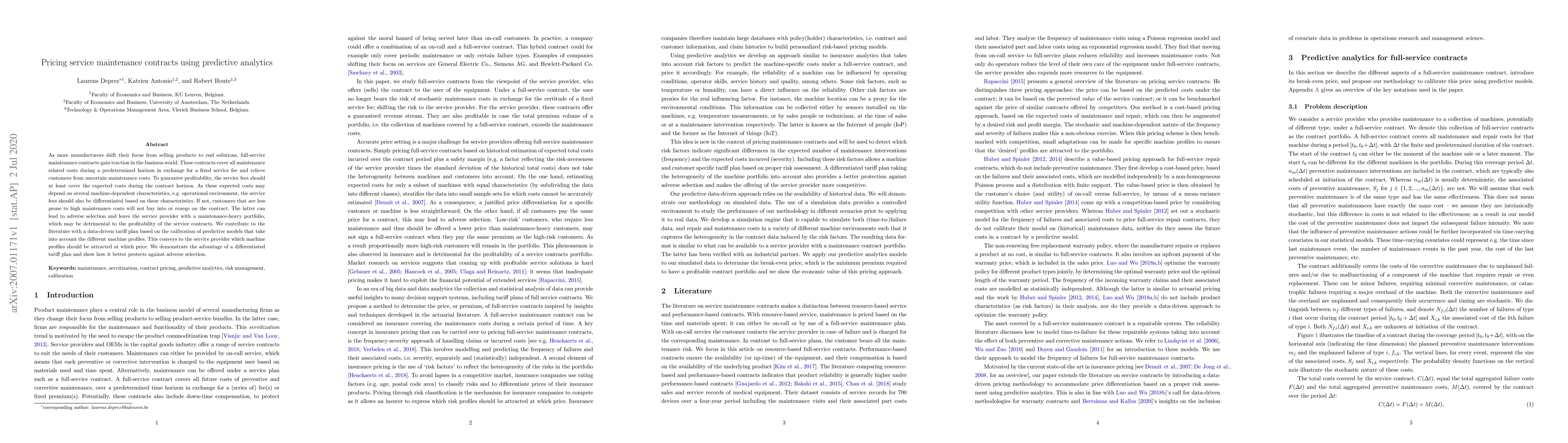 A data-driven approach is used to create a pricing plan for service maintenance contracts that takes into account machine characteristics to prevent adverse selection. The study demonstrates the effectiveness of differentiated tariff plans in protecting against customer renege.
