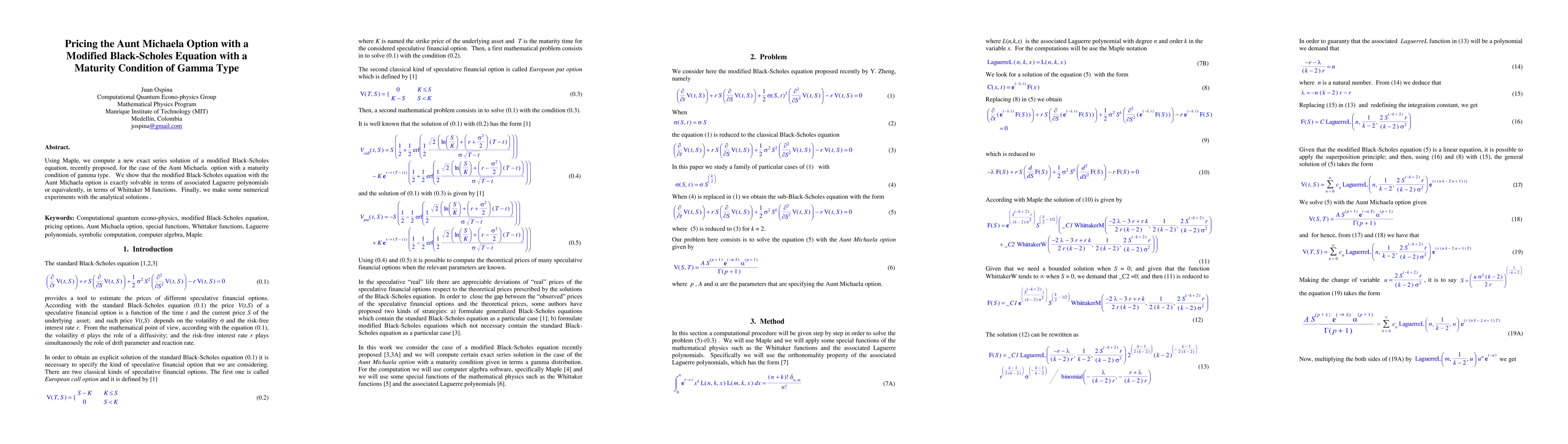 Using Maple, we compute a new exact series solution of a modified Black-Scholes equation, recently proposed, for the case of the Aunt Michaela option with a maturity condition of gamma type. We show that the modified Black-Scholes equation with the Aunt Michaela option is exactly solvable in terms of associated Laguerre polynomials or equivalently, in terms of Whittaker M functions. Finally, we make some numerical experiments with the analytical solutions