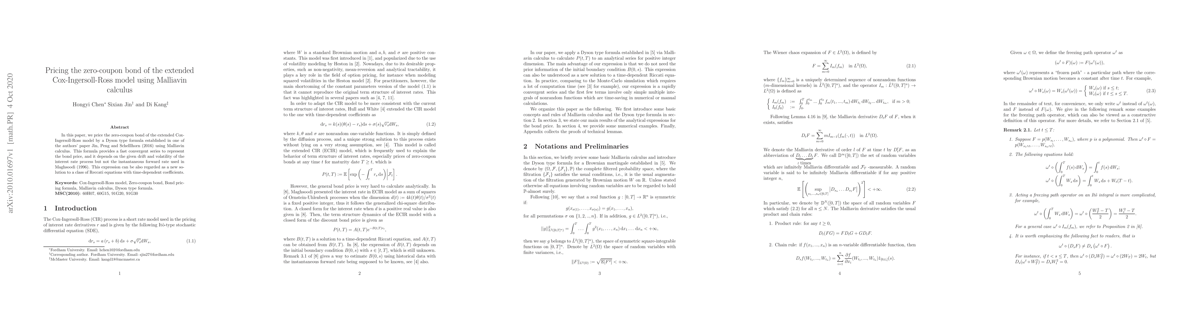 This paper employs Malliavin calculus to price the zero-coupon bond of the extended Cox-Ingersoll-Ross model using a Dyson type formula, offering a fast convergent series representation that depends on the interest rate's drift and volatility, not the instantaneous forward rate.