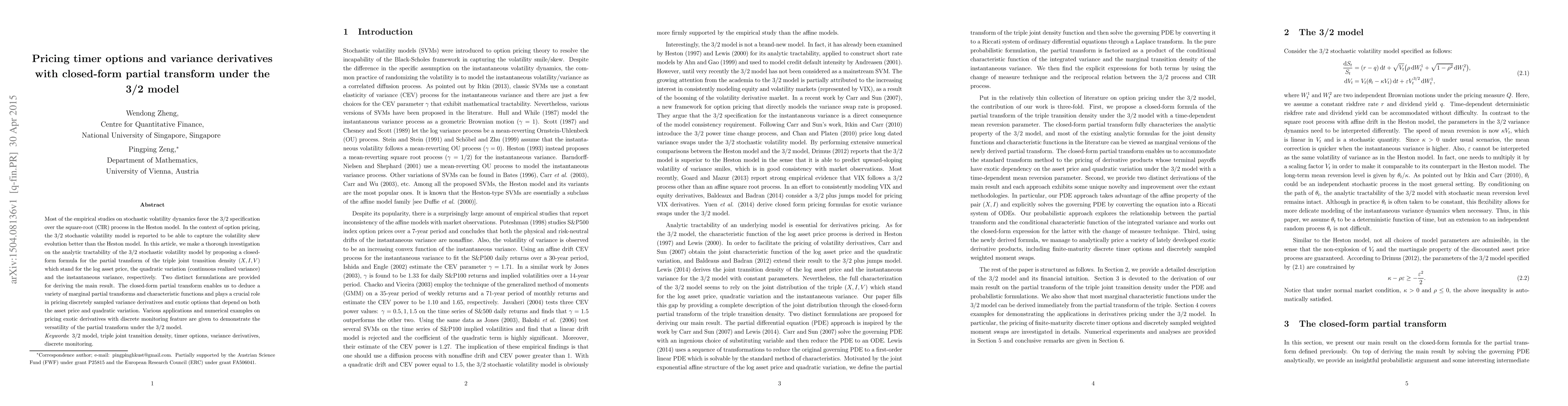 This paper proposes a closed-form partial transform for the 3/2 stochastic volatility model, enabling the pricing of timer options and variance derivatives. The method provides marginal partial transforms and characteristic functions, facilitating the valuation of exotic options and discretely sampled variance derivatives.