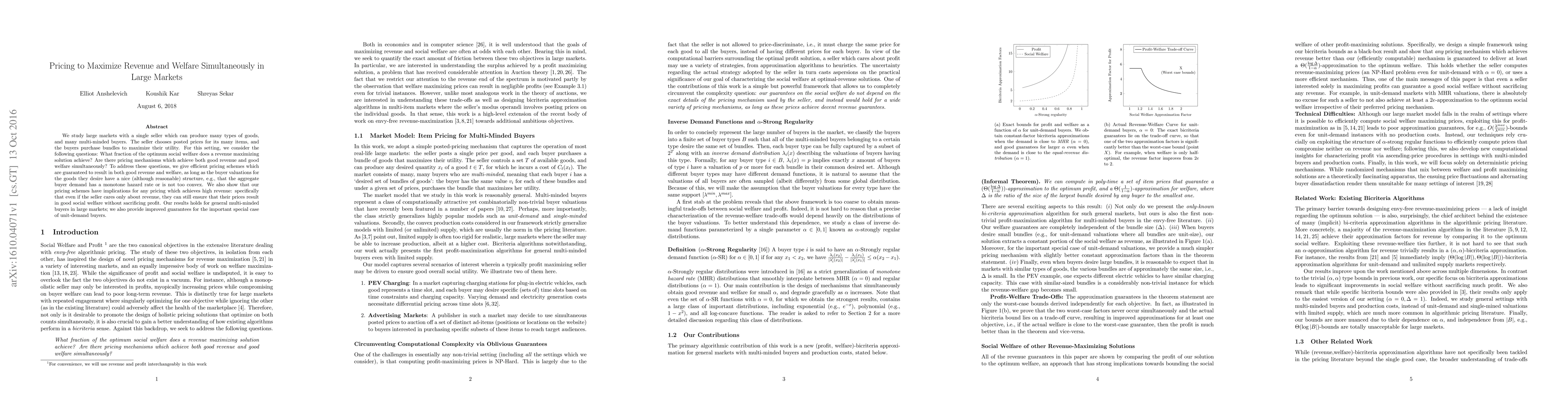 This paper explores pricing strategies in large markets to maximize both seller revenue and social welfare, proposing efficient schemes that achieve both goals under certain valuation structures. It demonstrates that even revenue-focused pricing can inherently ensure good social welfare without compromising profit.