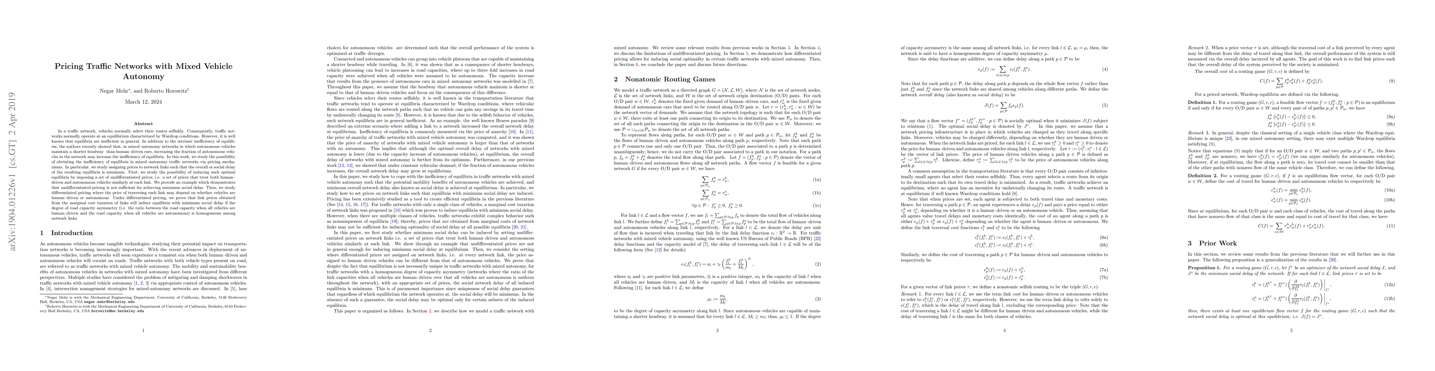 This paper explores pricing strategies to mitigate inefficiencies in mixed-autonomy traffic networks where autonomous vehicles have shorter headways than human-driven cars. It shows that undifferentiated pricing is insufficient for optimal equilibria, but differentiated pricing based on marginal cost can achieve minimum social delay, provided road capacity asymmetry is uniform across links.