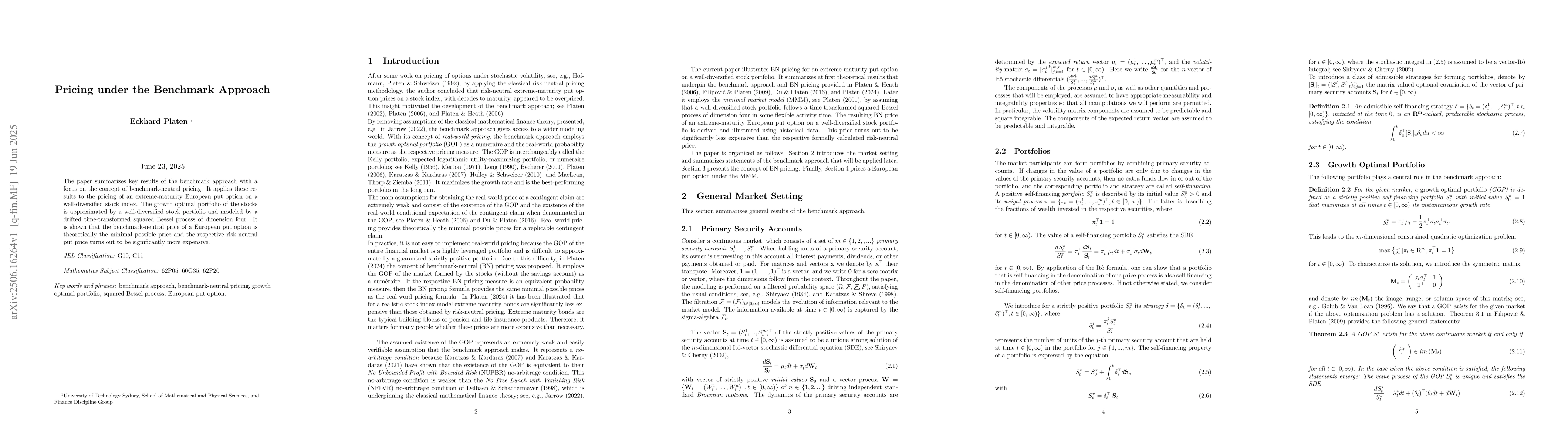 The paper summarizes key results of the benchmark approach with a focus on the concept of benchmark-neutral pricing. It applies these results to the pricing of an extreme-maturity European put option on a well-diversified stock index. The growth optimal portfolio of the stocks is approximated by a well-diversified stock portfolio and modeled by a drifted time-transformed squared Bessel process of dimension four. It is shown that the benchmark-neutral price of a European put option is theoretically the minimal possible price and the respective risk-neutral put price turns out to be significantly more expensive.