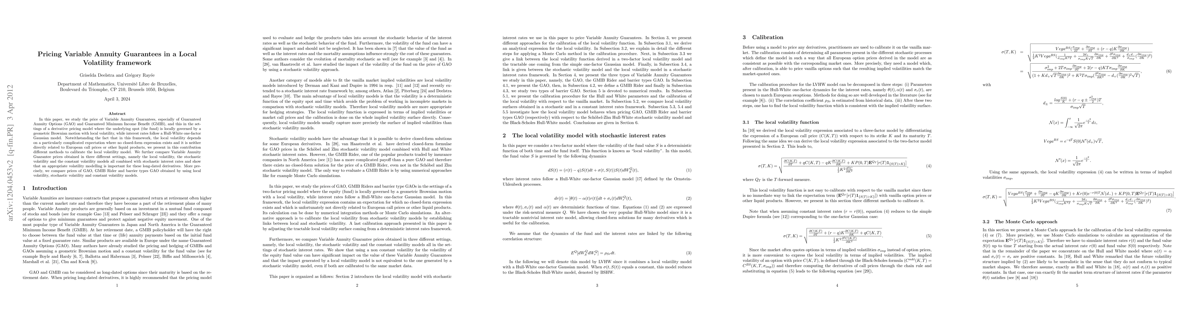 This paper explores pricing Variable Annuity Guarantees, specifically GAO and GMIB, within a local volatility framework where the underlying asset follows a geometric Brownian motion and interest rates are modeled using Hull-White. It presents calibration methods for the local volatility model and compares GAO and GMIB prices across local, stochastic, and constant volatility models, emphasizing the importance of appropriate volatility modeling for long-dated derivatives.