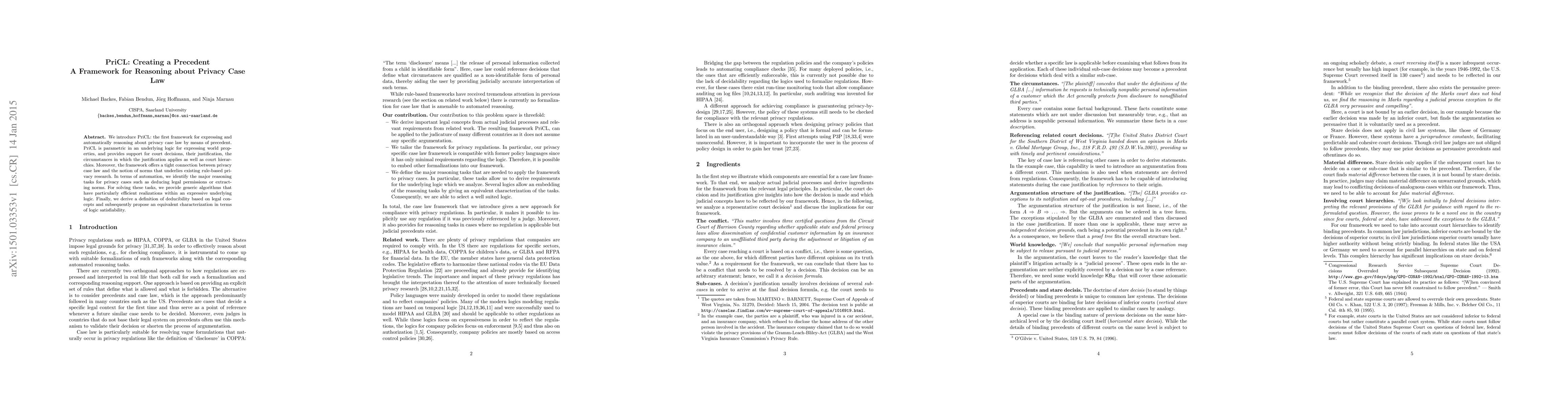PriCL introduces a novel framework for reasoning about privacy case law through precedent, supporting court decisions, justifications, and hierarchies. It automates major reasoning tasks like deducing legal permissions and extracting norms, utilizing efficient algorithms within an expressive underlying logic.