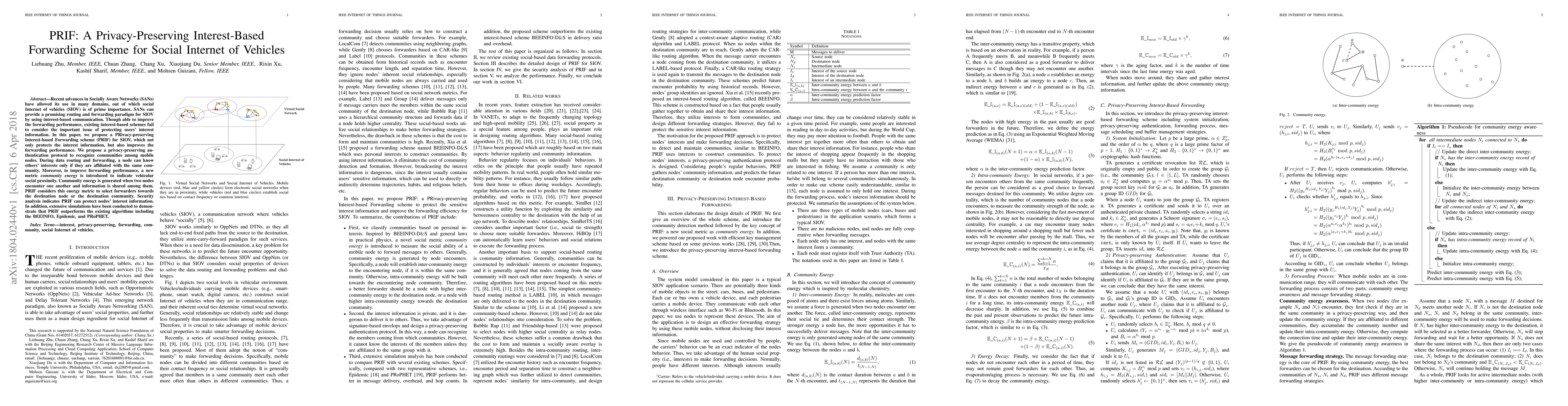 The paper proposes PRIF, a privacy-preserving interest-based forwarding scheme for social Internet of Vehicles (SIOV), which protects users' interest information while improving routing performance through a community energy metric. PRIF uses a privacy-preserving authentication protocol to recognize communities and enhance forwarding efficiency.