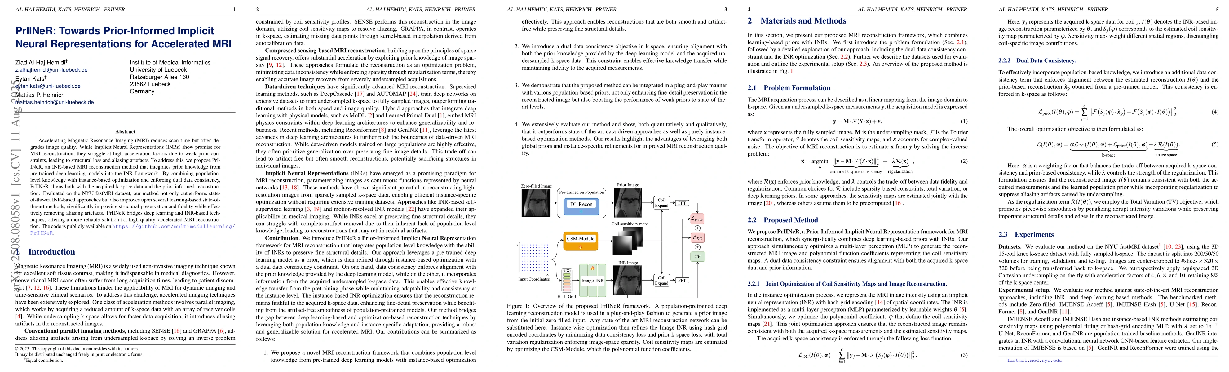 The paper proposes PrIINeR, an MRI reconstruction method that integrates prior knowledge from pre-trained deep learning models into Implicit Neural Representations (INRs). It combines population-level knowledge with instance-based optimization and enforces dual data consistency to align with both acquired k-space data and prior-informed reconstruction.