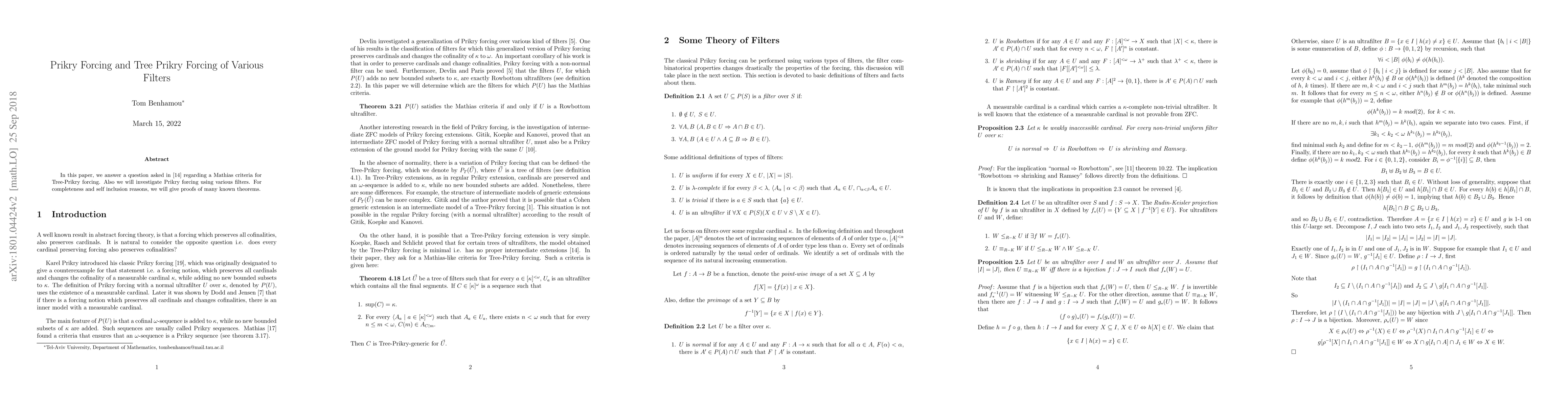 This paper explores Prikry forcing and Tree-Prikry forcing through various filters, addressing a question about Mathias criteria for Tree-Prikry forcing and providing proofs of several known theorems for completeness.