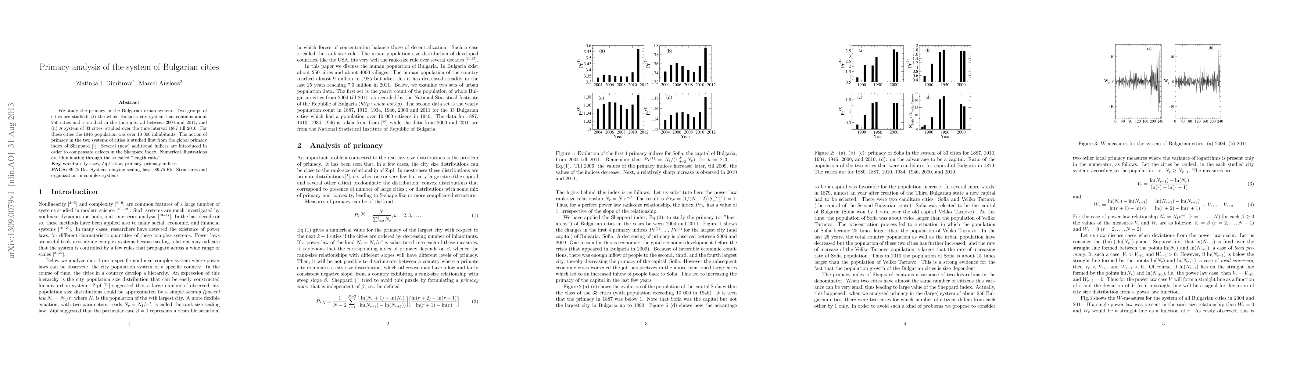 This paper examines the primacy in Bulgaria's urban system, analyzing two city groups over different time intervals. It introduces new indices to address limitations in the global primacy index, providing numerical insights through the "length ratio."