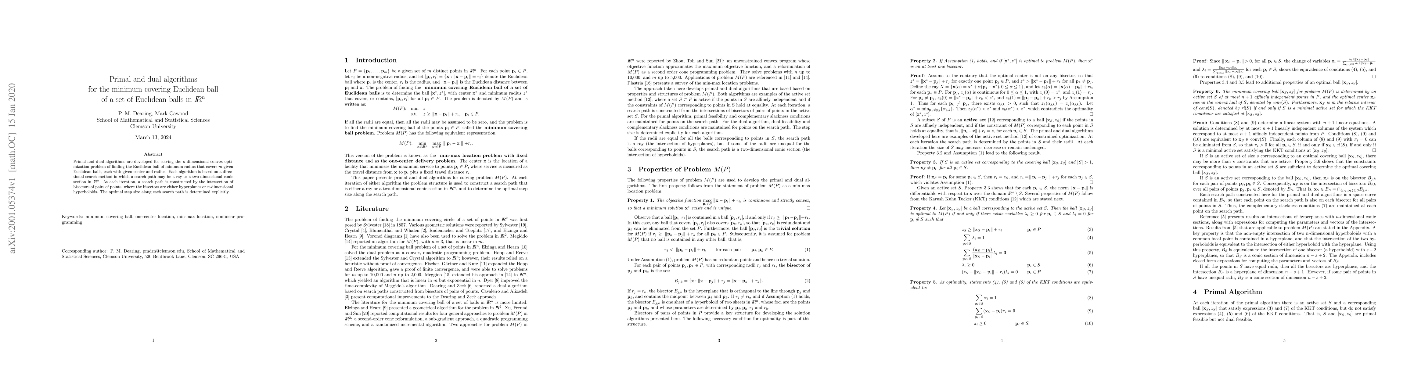 Researchers developed algorithms for finding the minimum radius Euclidean ball that covers multiple balls in n-dimensional space, using directional search methods and intersection of bisectors to determine optimal step sizes.