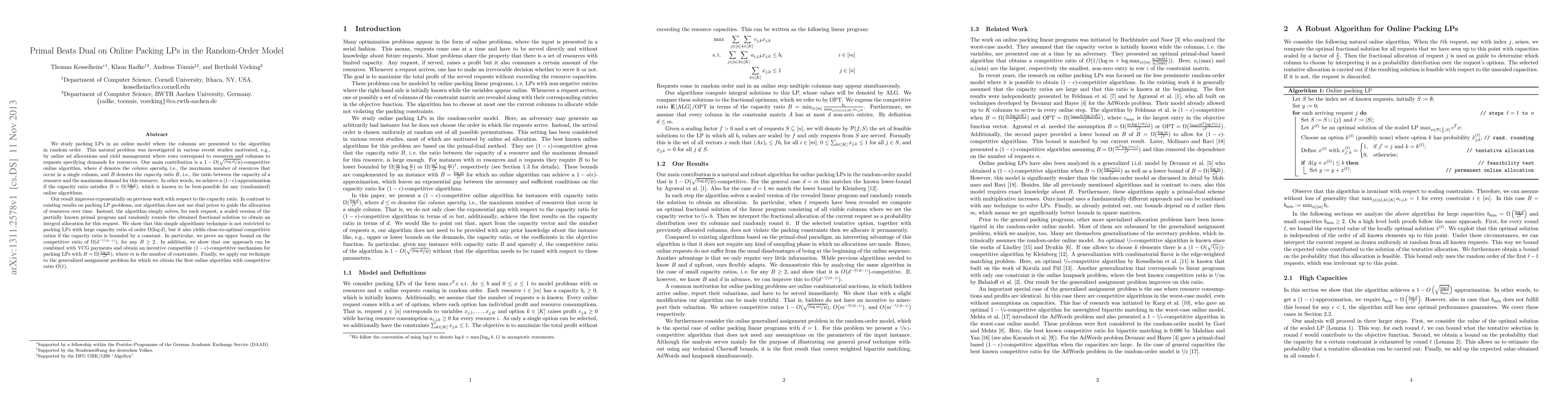 We study packing LPs in an online model where the columns are presented to the algorithm in random order. This natural problem was investigated in various recent studies motivated, e.g., by online ad allocations and yield management where rows correspond to resources and columns to requests specifying demands for resources. Our main contribution is a $1-O(\sqrt{(\log{d})/B})$-competitive online algorithm, where $d$ denotes the column sparsity, i.e., the maximum number of resources that occur in a single column, and $B$ denotes the capacity ratio $B$, i.e., the ratio between the capacity of a resource and the maximum demand for this resource. In other words, we achieve a $(1 - \epsilon)$-approximation if the capacity ratio satisfies $B=\Omega((\log d)/\epsilon^2)$, which is known to be best-possible for any (randomized) online algorithms. Our result improves exponentially on previous work with respect to the capacity ratio. In contrast to existing results on packing LP problems, our algorithm does not use dual prices to guide the allocation of resources. Instead, it simply solves, for each request, a scaled version of the partially known primal program and randomly rounds the obtained fractional solution to obtain an integral allocation for this request. We show that this simple algorithmic technique is not restricted to packing LPs with large capacity ratio: We prove an upper bound on the competitive ratio of $\Omega(d^{-1/(B-1)})$, for any $B \ge 2$. In addition, we show that our approach can be combined with VCG payments and obtain an incentive compatible $(1-\epsilon)$-competitive mechanism for packing LPs with $B=\Omega((\log m)/\epsilon^2)$, where $m$ is the number of constraints. Finally, we apply our technique to the generalized assignment problem for which we obtain the first online algorithm with competitive ratio $O(1)$.