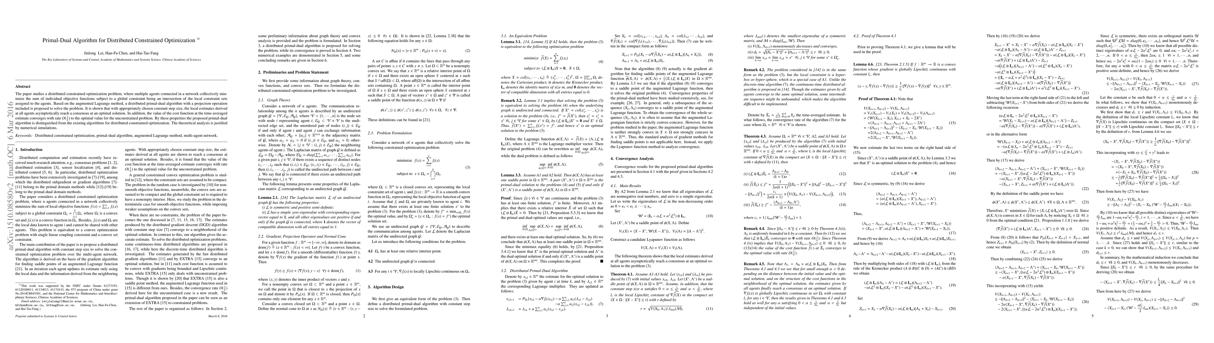 This paper proposes a distributed primal-dual algorithm for solving constrained optimization problems in networked agents, leveraging the augmented Lagrange method. The algorithm achieves consensus among agents and converges to an optimal solution with a rate of $O(\frac{1}{k})$.
