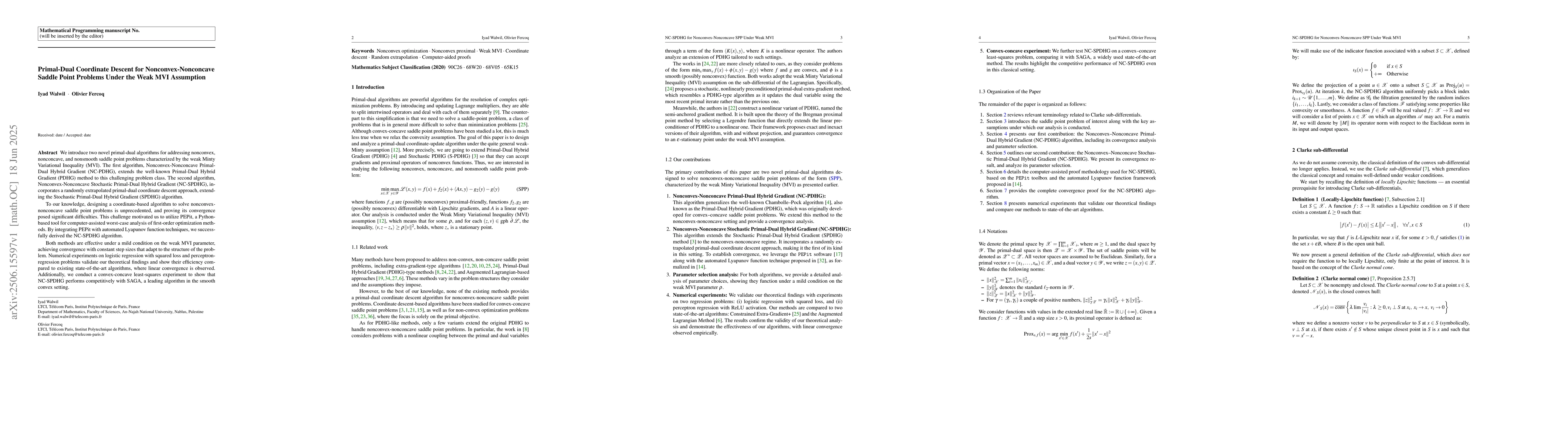 We introduce two novel primal-dual algorithms for addressing nonconvex, nonconcave, and nonsmooth saddle point problems characterized by the weak Minty Variational Inequality (MVI). The first algorithm, Nonconvex-Nonconcave Primal-Dual Hybrid Gradient (NC-PDHG), extends the well-known Primal-Dual Hybrid Gradient (PDHG) method to this challenging problem class. The second algorithm, Nonconvex-Nonconcave Stochastic Primal-Dual Hybrid Gradient (NC-SPDHG), incorporates a randomly extrapolated primal-dual coordinate descent approach, extending the Stochastic Primal-Dual Hybrid Gradient (SPDHG) algorithm. To our knowledge, designing a coordinate-based algorithm to solve nonconvex-nonconcave saddle point problems is unprecedented, and proving its convergence posed significant difficulties. This challenge motivated us to utilize PEPit, a Python-based tool for computer-assisted worst-case analysis of first-order optimization methods. By integrating PEPit with automated Lyapunov function techniques, we successfully derived the NC-SPDHG algorithm. Both methods are effective under a mild condition on the weak MVI parameter, achieving convergence with constant step sizes that adapt to the structure of the problem. Numerical experiments on logistic regression with squared loss and perceptron-regression problems validate our theoretical findings and show their efficiency compared to existing state-of-the-art algorithms, where linear convergence is observed. Additionally, we conduct a convex-concave least-squares experiment to show that NC-SPDHG performs competitively with SAGA, a leading algorithm in the smooth convex setting.