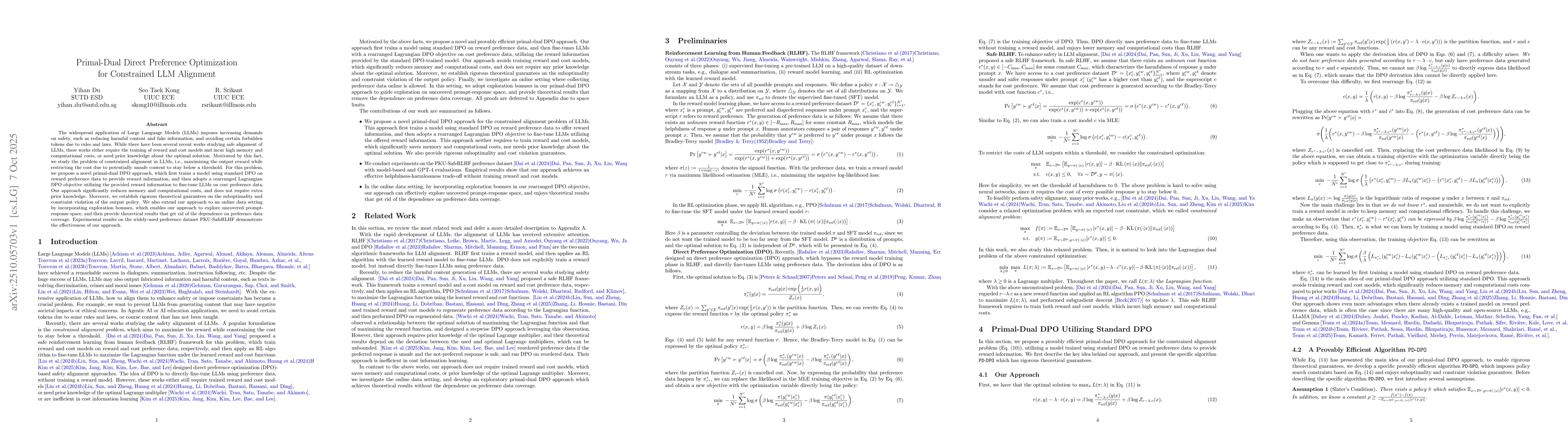 The widespread application of Large Language Models (LLMs) imposes increasing demands on safety, such as reducing harmful content and fake information, and avoiding certain forbidden tokens due to rules and laws. While there have been several recent works studying safe alignment of LLMs, these works either require the training of reward and cost models and incur high memory and computational costs, or need prior knowledge about the optimal solution. Motivated by this fact, we study the problem of constrained alignment in LLMs, i.e., maximizing the output reward while restricting the cost due to potentially unsafe content to stay below a threshold. For this problem, we propose a novel primal-dual DPO approach, which first trains a model using standard DPO on reward preference data to provide reward information, and then adopts a rearranged Lagrangian DPO objective utilizing the provided reward information to fine-tune LLMs on cost preference data. Our approach significantly reduces memory and computational costs, and does not require extra prior knowledge. Moreover, we establish rigorous theoretical guarantees on the suboptimality and constraint violation of the output policy. We also extend our approach to an online data setting by incorporating exploration bonuses, which enables our approach to explore uncovered prompt-response space, and then provide theoretical results that get rid of the dependence on preference data coverage. Experimental results on the widely-used preference dataset PKU-SafeRLHF demonstrate the effectiveness of our approach.