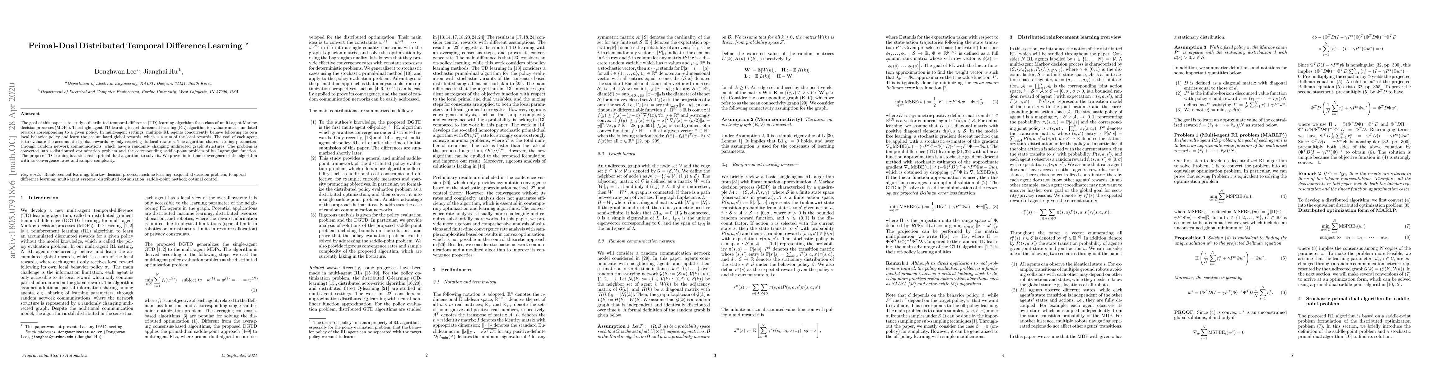 This paper proposes a distributed version of the gradient temporal-difference (GTD) learning algorithm for multi-agent Markov decision processes, converting the global value function estimation into a constrained convex optimization problem, and introducing a stochastic primal-dual algorithm that converges to a solution.