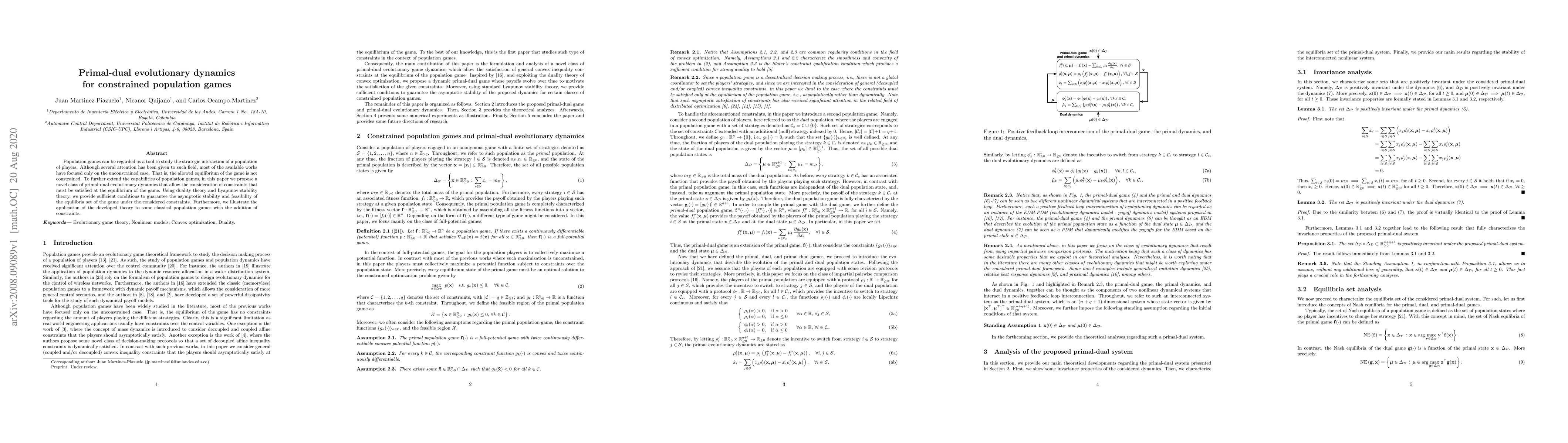 This paper introduces primal-dual evolutionary dynamics for constrained population games, providing conditions for stable equilibria with added constraints. It applies the theory to classical games with constraints, expanding capabilities of population game studies.