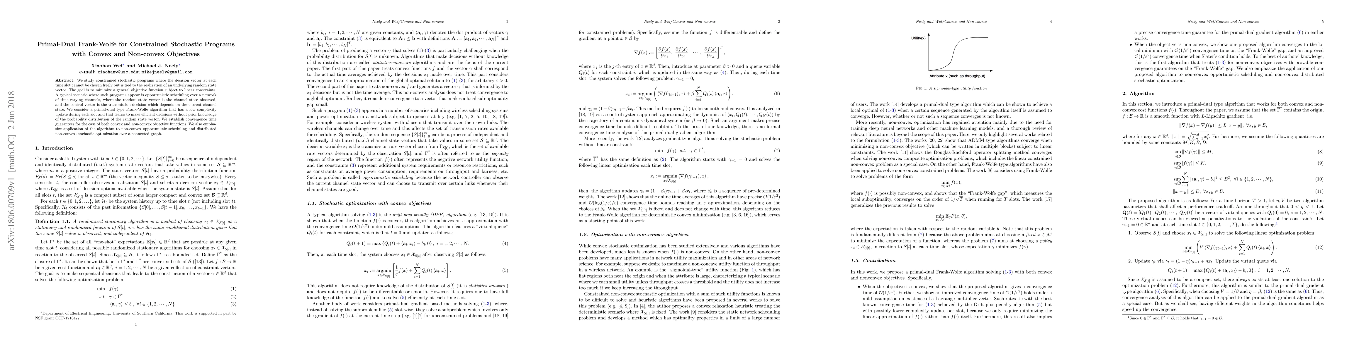 This paper proposes a primal-dual Frank-Wolfe algorithm for solving constrained stochastic programs with both convex and non-convex objectives, applicable in scenarios like opportunistic scheduling over time-varying channels. The algorithm achieves low-complexity updates and convergence guarantees without prior knowledge of the random state vector distribution.