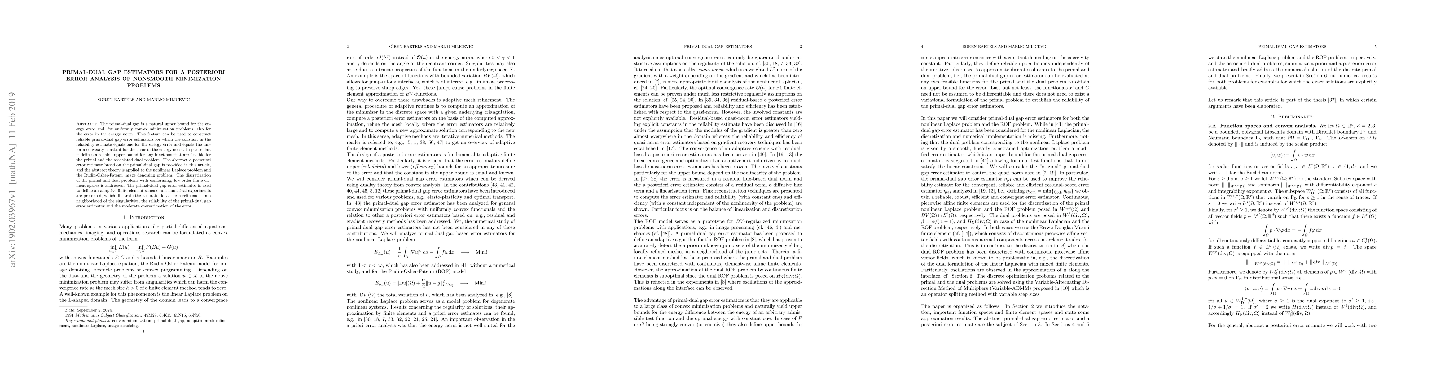 This paper develops primal-dual gap estimators for a posteriori error analysis in nonsmooth minimization problems, showing they provide reliable upper bounds for both energy error and error in the energy norm. The method is applied to the nonlinear Laplace problem and Rudin-Osher-Fatemi image denoising, demonstrating adaptive finite element refinement and moderate error overestimation.