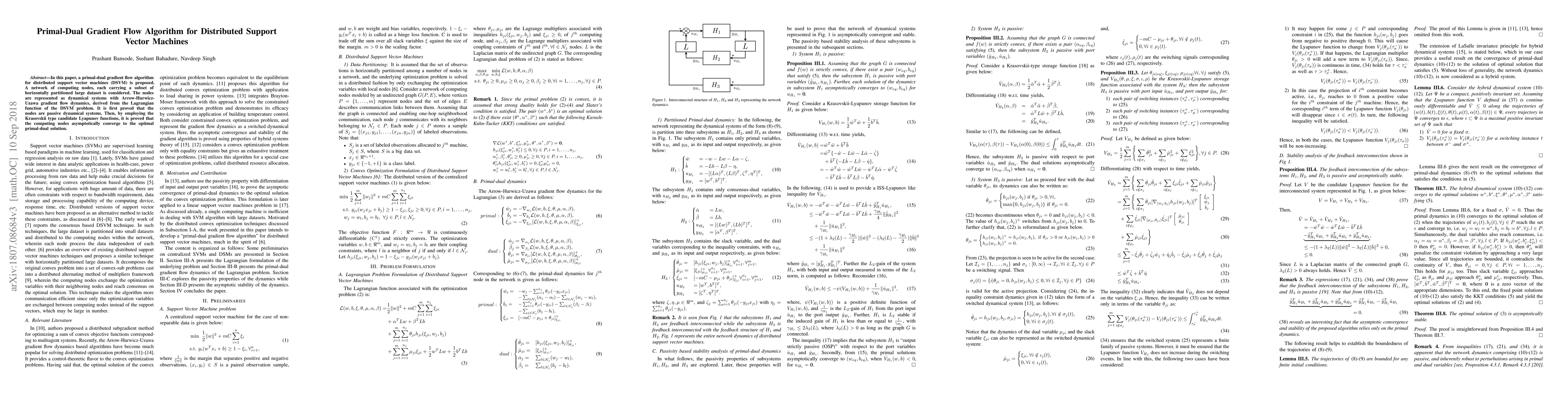 This paper proposes a primal-dual gradient flow algorithm for distributed support vector machines, utilizing Arrow-Hurwicz-Uzawa dynamics. It proves nodes' passivity and demonstrates asymptotic convergence to the optimal solution using Krasovskii type Lyapunov functions.