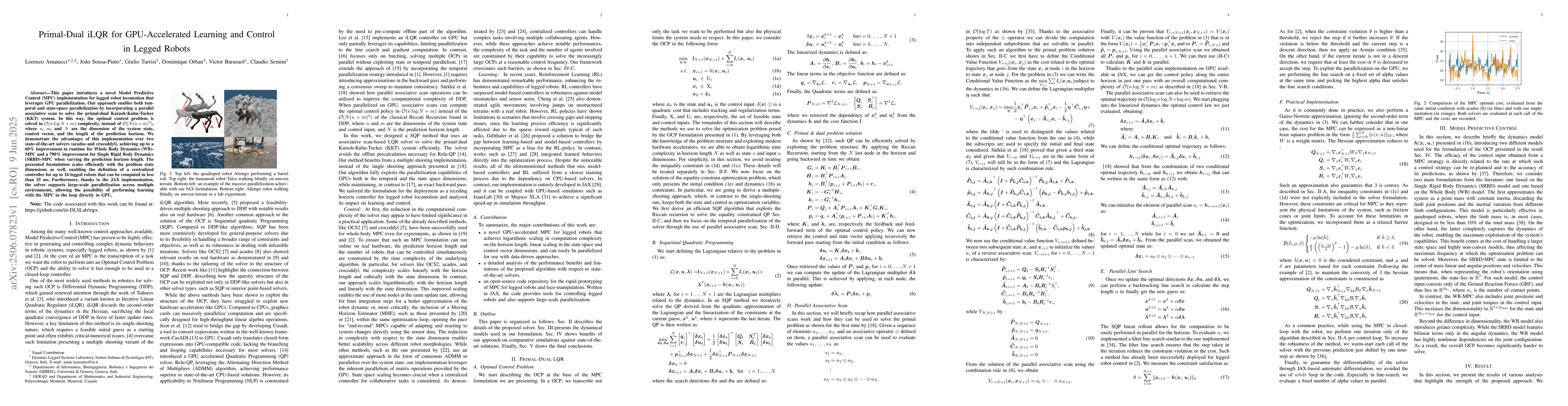 A new MPC implementation using GPU parallelization improves legged robot locomotion with up to 60% runtime reduction and enables centralized control for 16 robots in under 25ms.