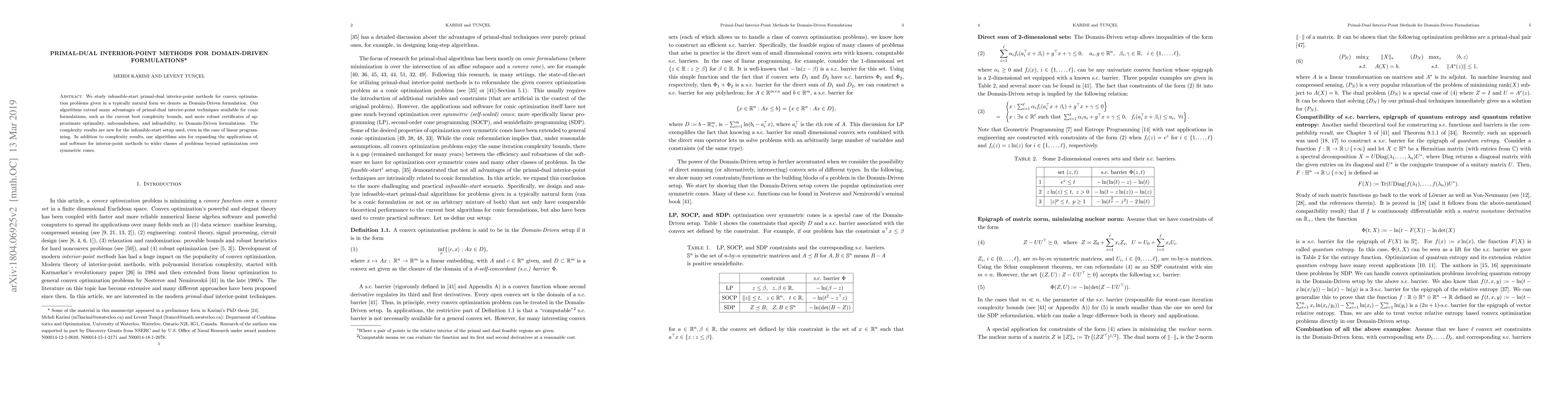 We study infeasible-start primal-dual interior-point methods for convex optimization problems given in a typically natural form we denote as Domain-Driven formulation. Our algorithms extend many advantages of primal-dual interior-point techniques available for conic formulations, such as the current best complexity bounds, and more robust certificates of approximate optimality, unboundedness, and infeasibility, to Domain-Driven formulations. The complexity results are new for the infeasible-start setup used, even in the case of linear programming. In addition to complexity results, our algorithms aim for expanding the applications of, and software for interior-point methods to wider classes of problems beyond optimization over symmetric cones.