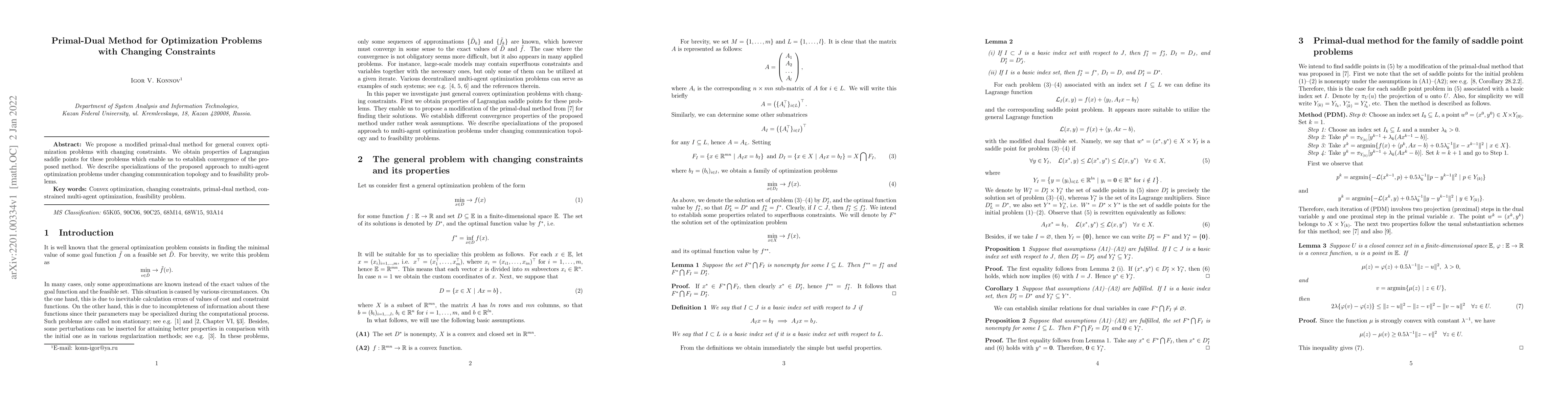 This paper introduces a modified primal-dual method for convex optimization problems with evolving constraints, establishing its convergence through properties of Lagrangian saddle points. It also applies the method to multi-agent optimization and feasibility problems under varying communication topology.