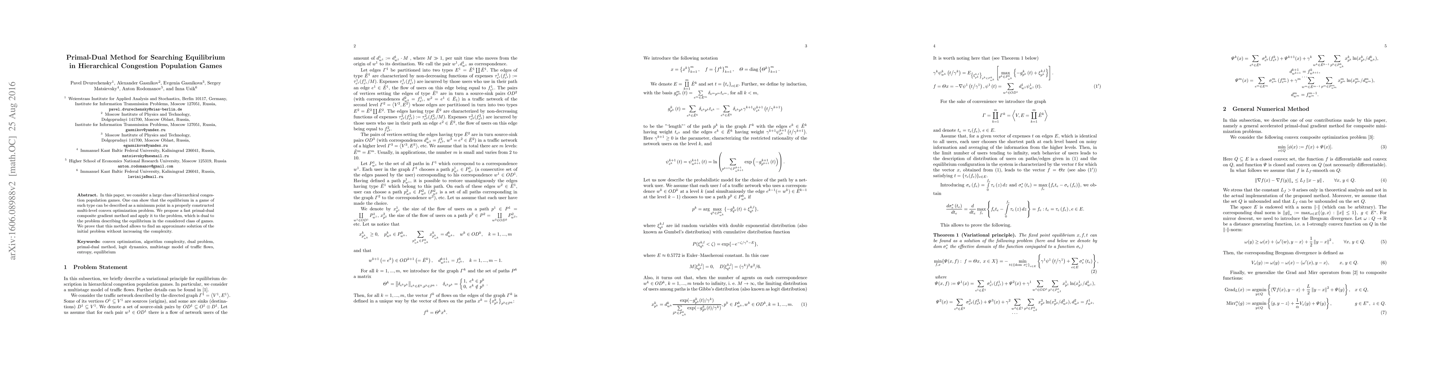 A new method is proposed for finding equilibrium in hierarchical congestion population games, using a fast primal-dual composite gradient method that can find approximate solutions without increasing complexity.