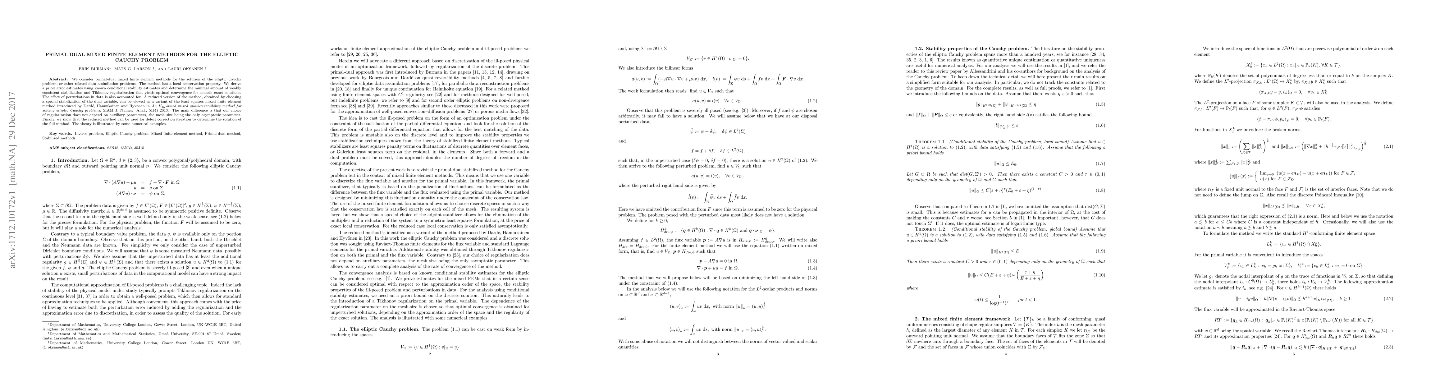 We consider primal-dual mixed finite element methods for the solution of the elliptic Cauchy problem, or other related data assimilation problems. The method has a local conservation property. We derive a priori error estimates using known conditional stability estimates and determine the minimal amount of weakly consistent stabilization and Tikhonov regularization that yields optimal convergence for smooth exact solutions. The effect of perturbations in data is also accounted for. A reduced version of the method, obtained by choosing a special stabilization of the dual variable, can be viewed as a variant of the least squares mixed finite element method introduced by Dard\'e, Hannukainen and Hyv\"onen in \emph{An {$H\sb {\sf{div}}$}-based mixed quasi-reversibility method for solving elliptic {C}auchy problems}, SIAM J. Numer. Anal., 51(4) 2013. The main difference is that our choice of regularization does not depend on auxiliary parameters, the mesh size being the only asymptotic parameter. Finally, we show that the reduced method can be used for defect correction iteration to determine the solution of the full method. The theory is illustrated by some numerical examples.