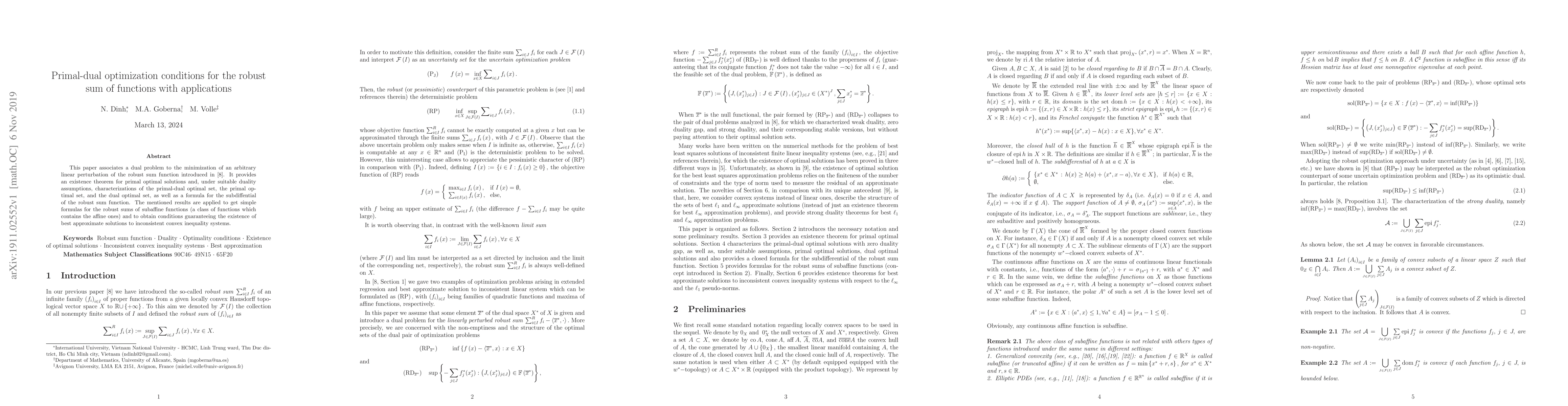 This paper develops conditions for optimal solutions to a specific optimization problem, with applications in robust sum functions and convex inequality systems.
