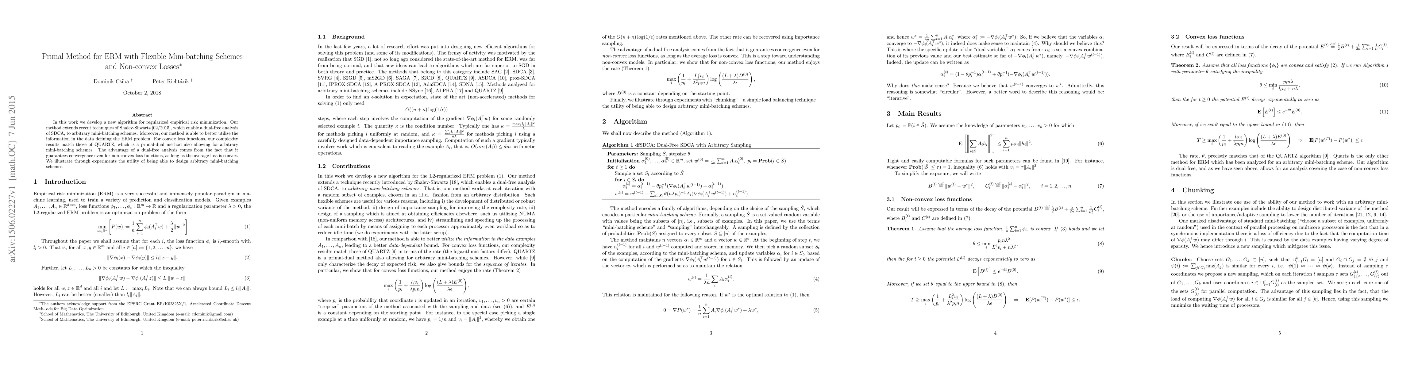 In this work we develop a new algorithm for regularized empirical risk minimization. Our method extends recent techniques of Shalev-Shwartz [02/2015], which enable a dual-free analysis of SDCA, to arbitrary mini-batching schemes. Moreover, our method is able to better utilize the information in the data defining the ERM problem. For convex loss functions, our complexity results match those of QUARTZ, which is a primal-dual method also allowing for arbitrary mini-batching schemes. The advantage of a dual-free analysis comes from the fact that it guarantees convergence even for non-convex loss functions, as long as the average loss is convex. We illustrate through experiments the utility of being able to design arbitrary mini-batching schemes.