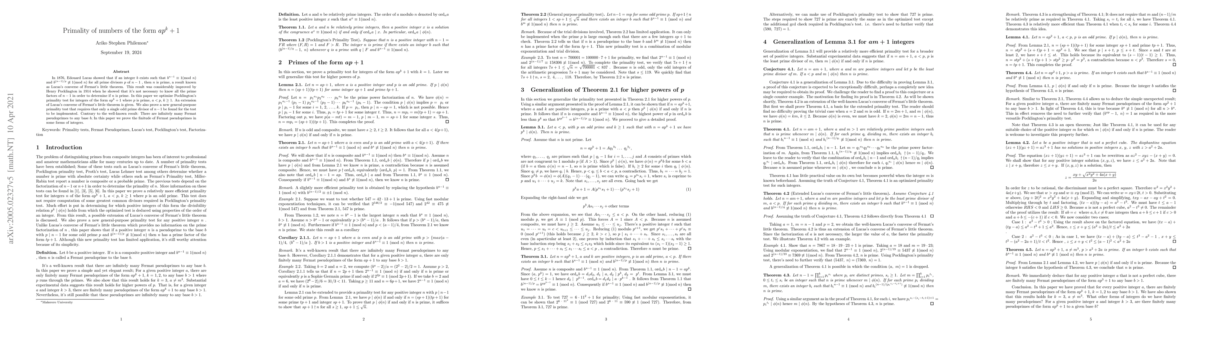 This paper optimizes Pocklington's primality test for numbers of the form $ap^{k}+1$, extending Lucas's converse of Fermat's little theorem and proving the finitude of Fermat pseudoprimes for certain integer forms.